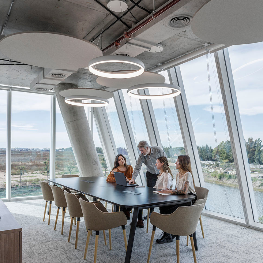 En cuanto a las terminaciones, se decidió poner en valor el hormigón nuevo del edificio, dejando la losa y las instalaciones a la vista. Para mejorar la acústica del open space se incorporaron discos fonoabsorbentes suspendidos.