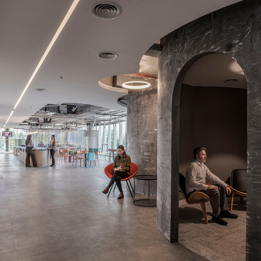 En la fachada sur, se diseñó el Work Café —también utilizado por clientes— y tres pequeñas burbujas de reunión revestidas con una terminación tipo estuco, creando una atmósfera cálida y distintiva.