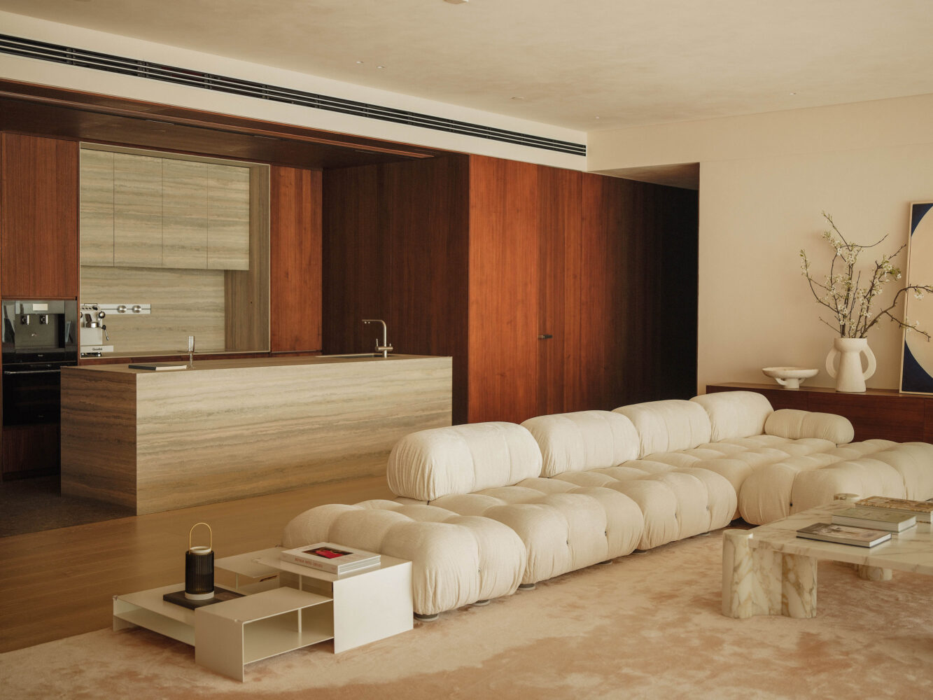 Aquí, el salón y la isla de cocina comparten un límite fluido, unidos por una continuidad de materiales y texturas: una fluidez constante que disuelve las divisiones entre función y forma.