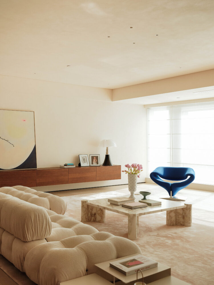 Un sofá modular de Mario Bellini en beige pálido establece una base serena.