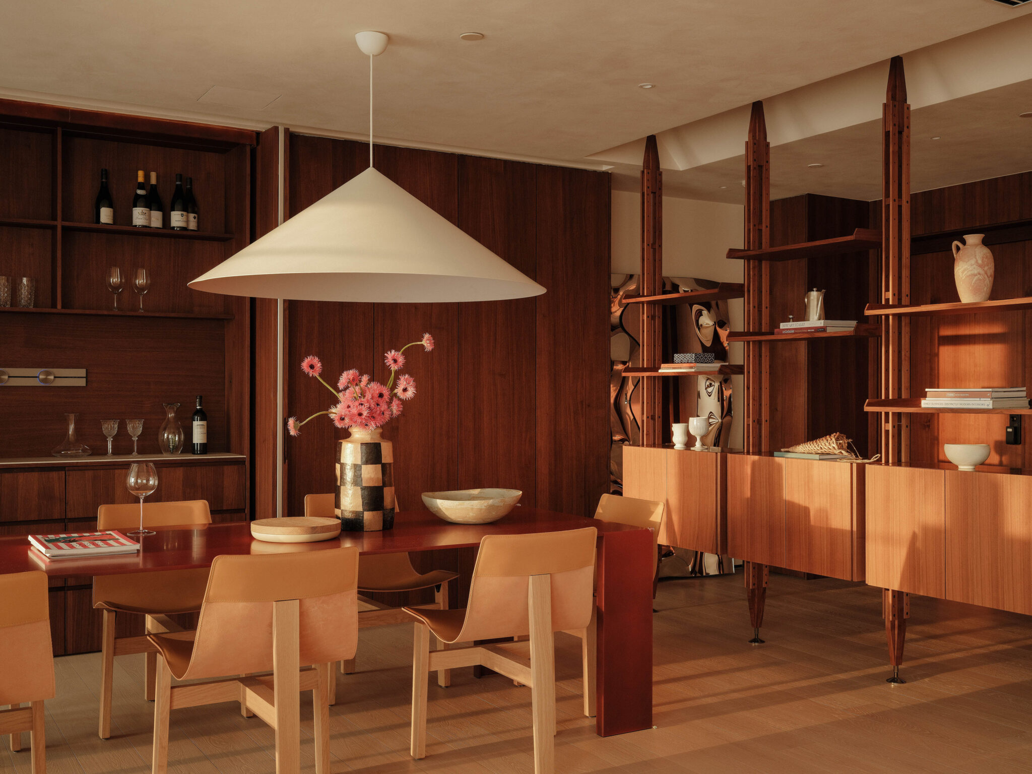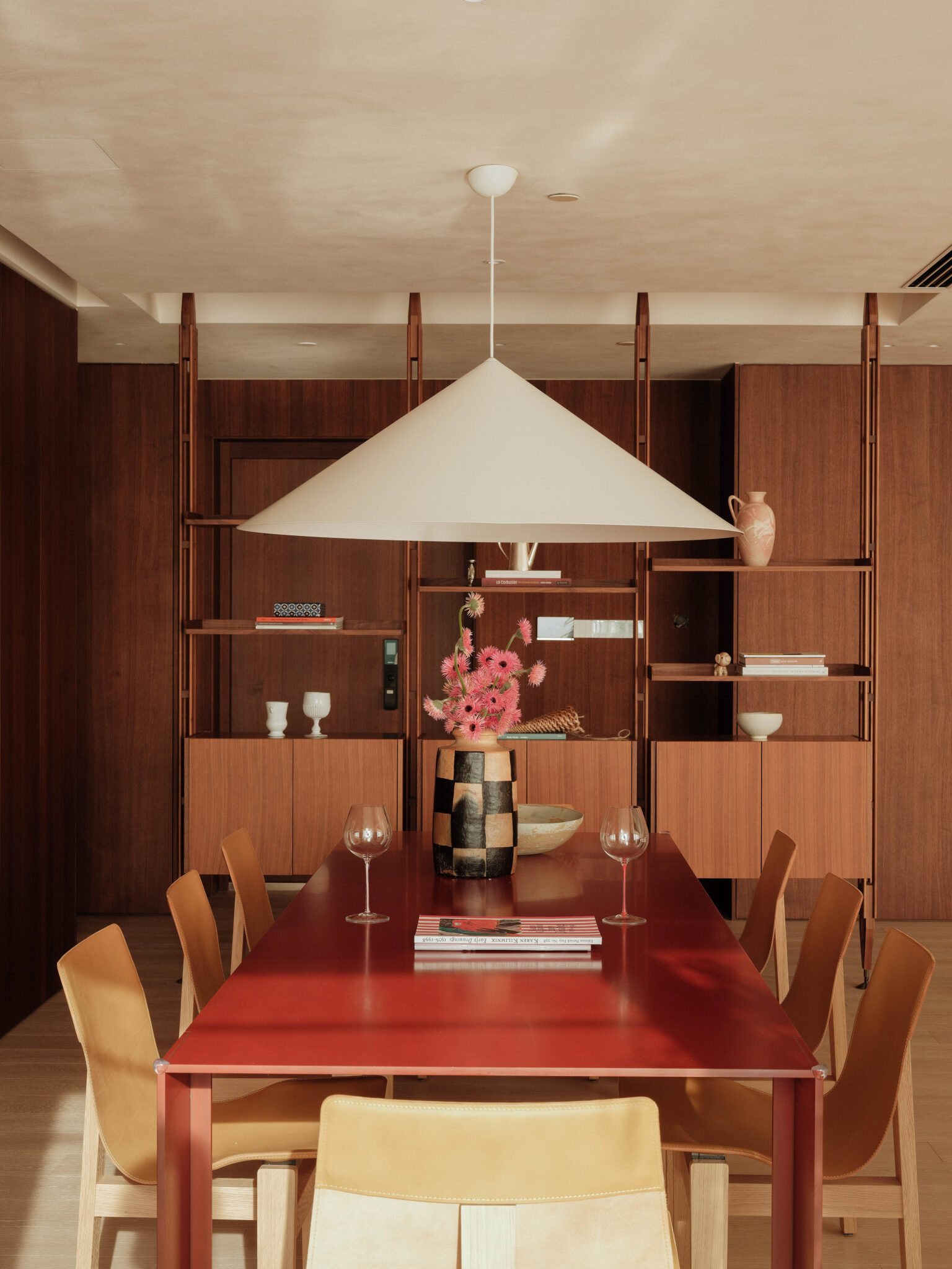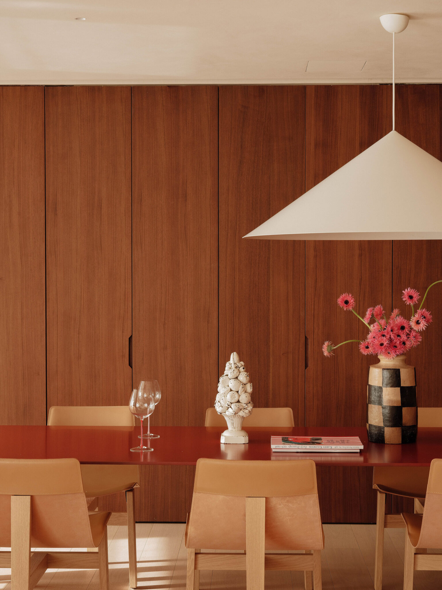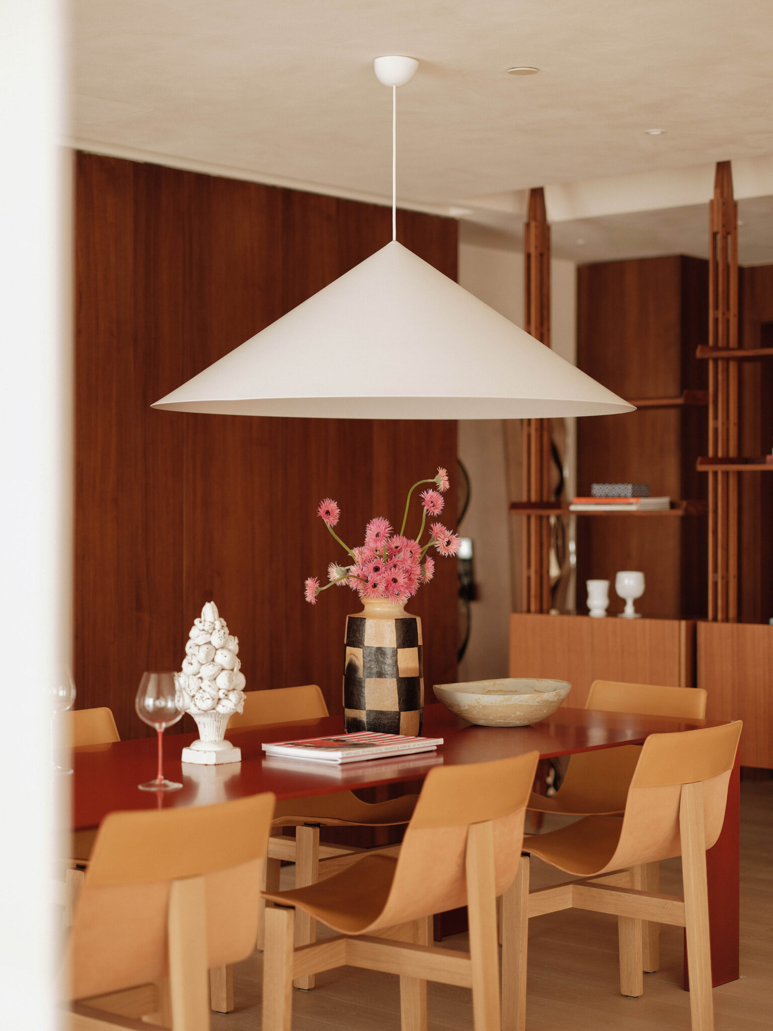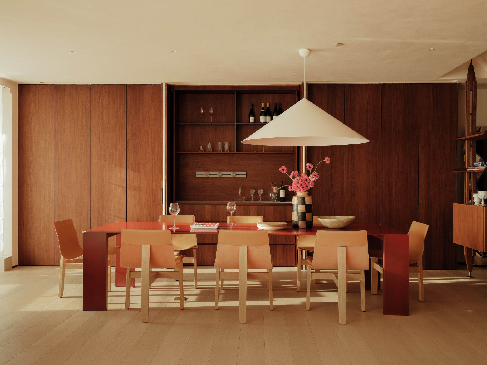 Una pieza roja de Porro y una lámpara colgante de Wästberg se reflejan mutuamente: dramáticas en escala, pero suavizadas por la calidez de la luz.
