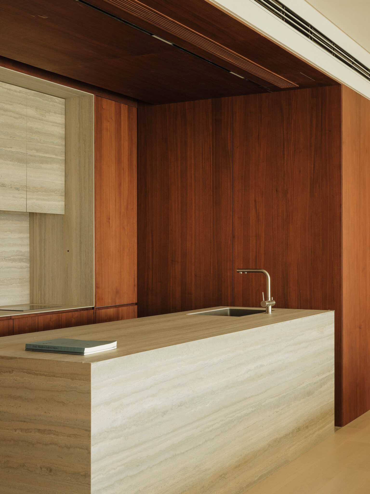 Aquí, el salón y la isla de cocina comparten un límite fluido, unidos por una continuidad de materiales y texturas: una fluidez constante que disuelve las divisiones entre función y forma.
