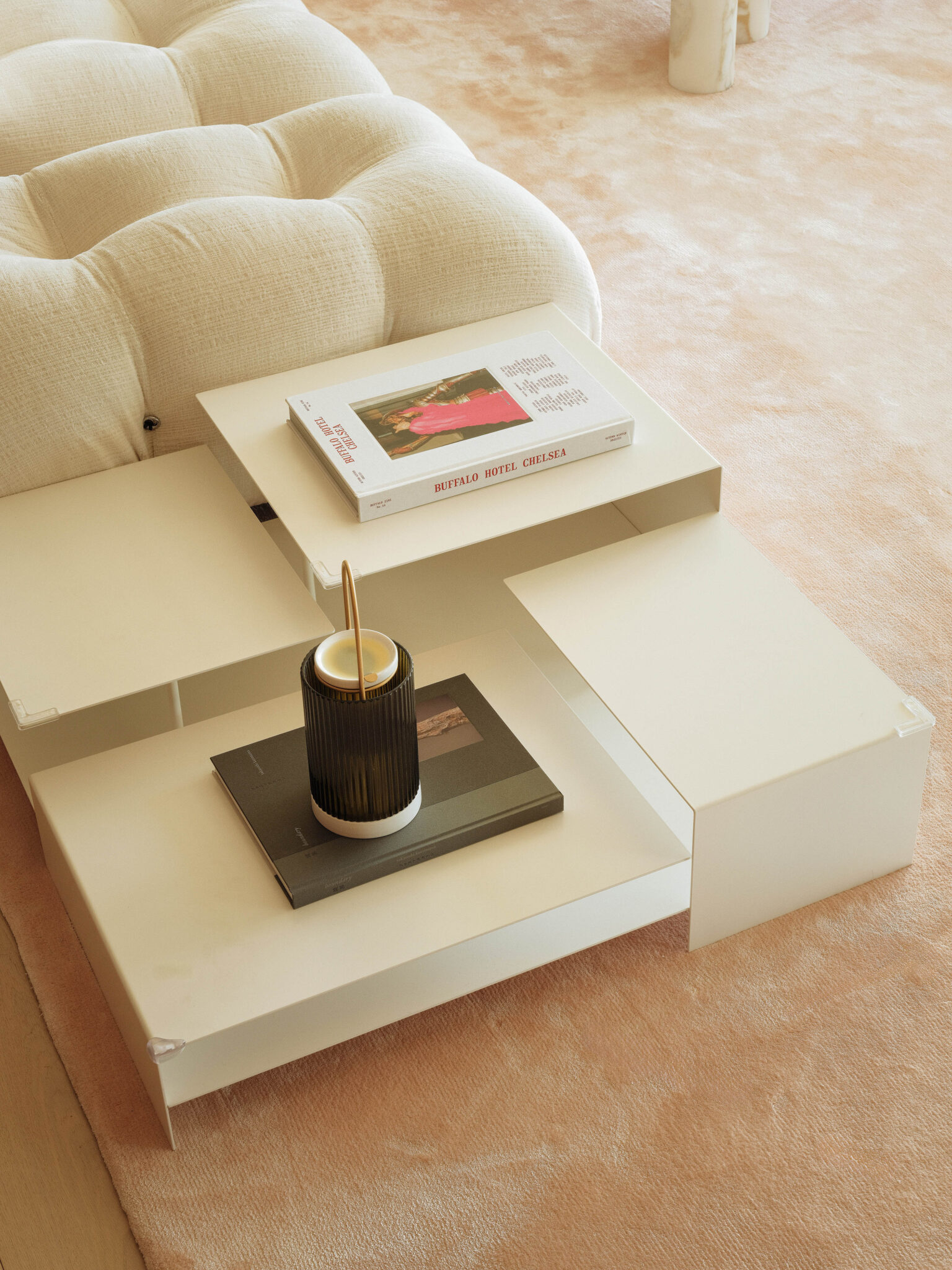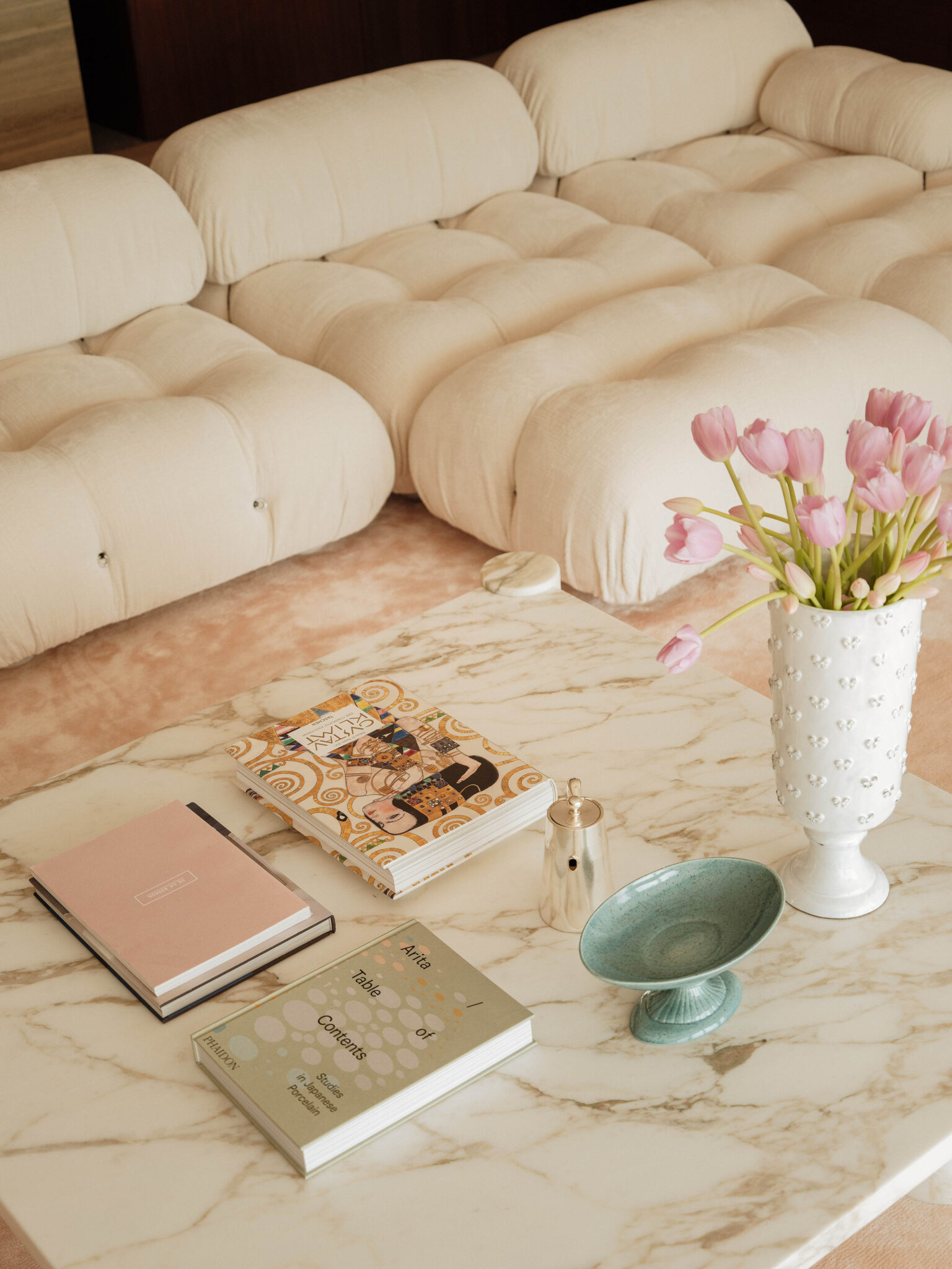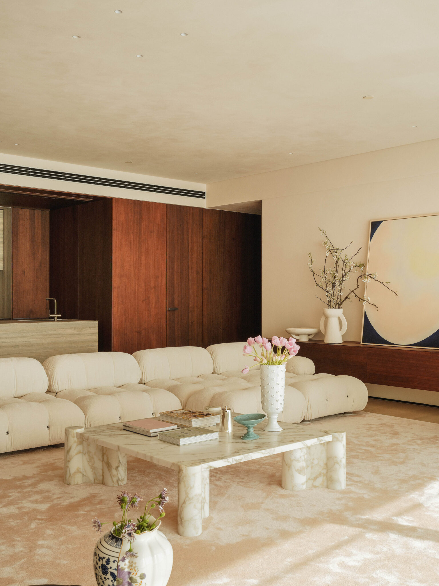 Un sofá modular de Mario Bellini en beige pálido establece una base serena.