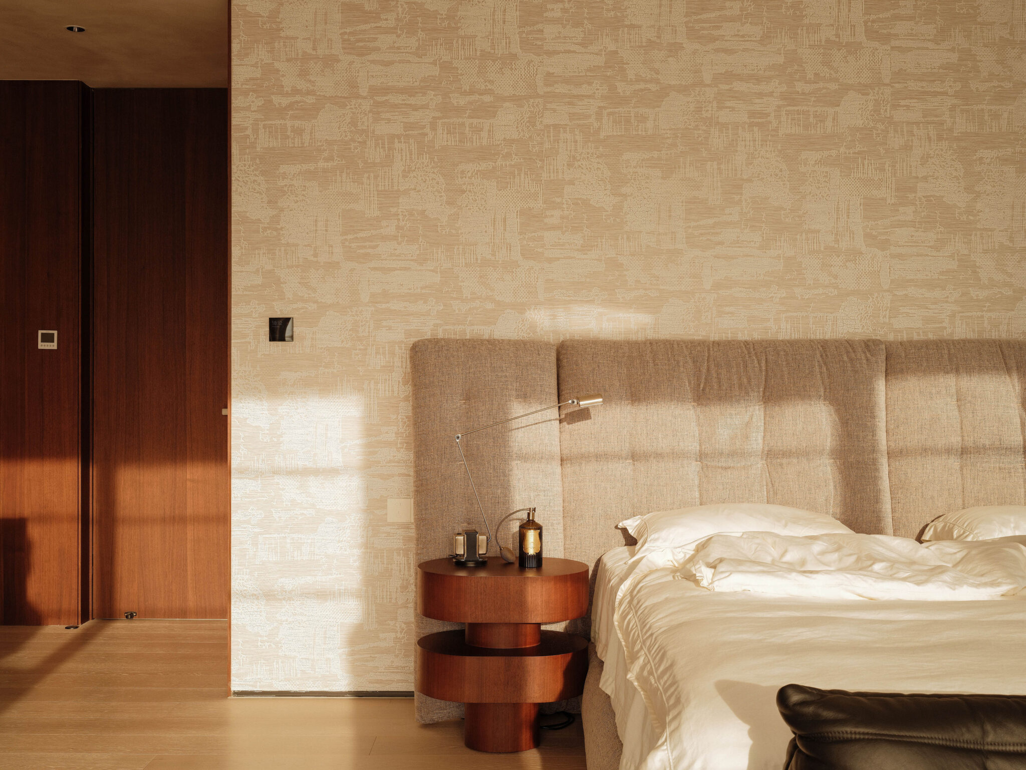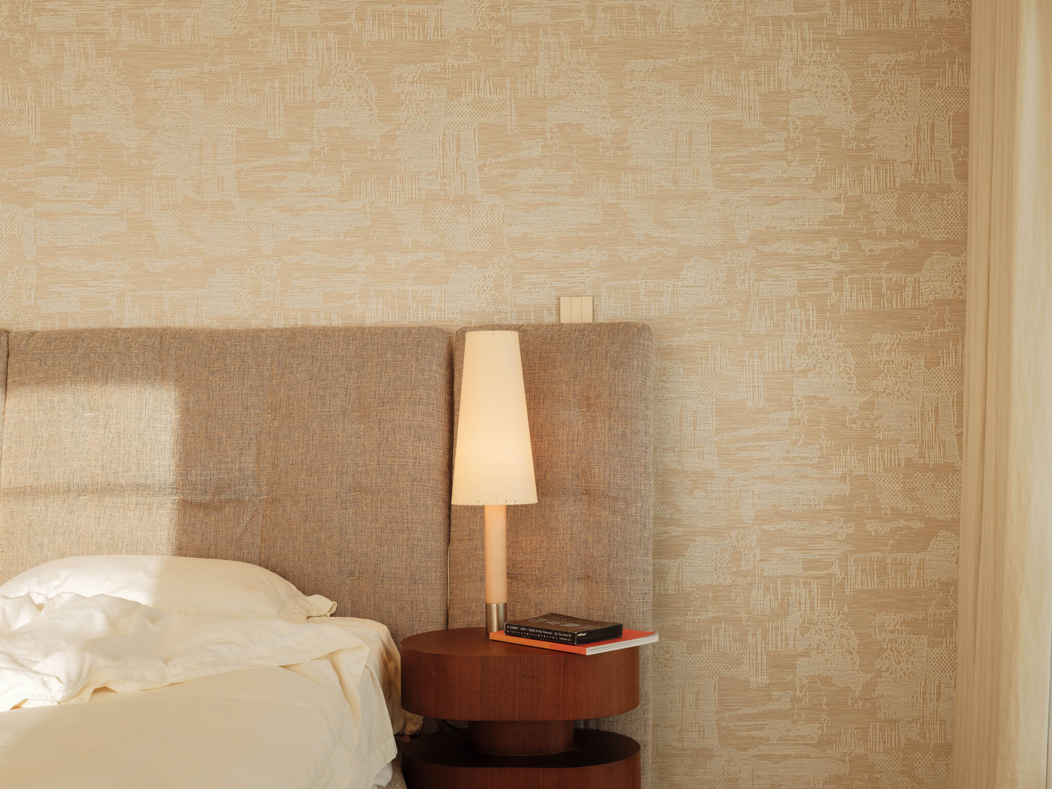 Un cabecero tapizado en beige se combina con un papel pintado de textura fina, cuyas capas son suavemente iluminadas por la luz del día.