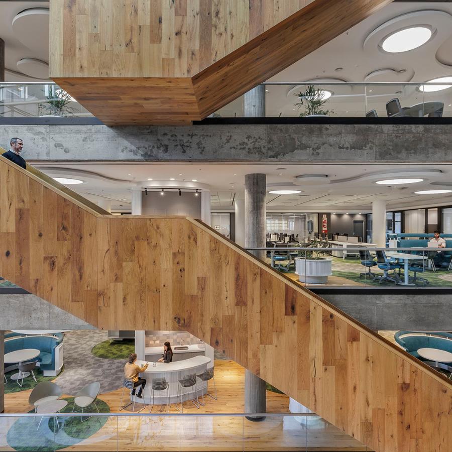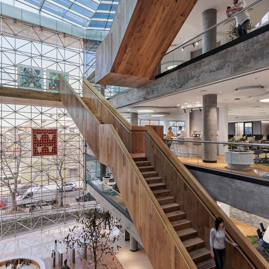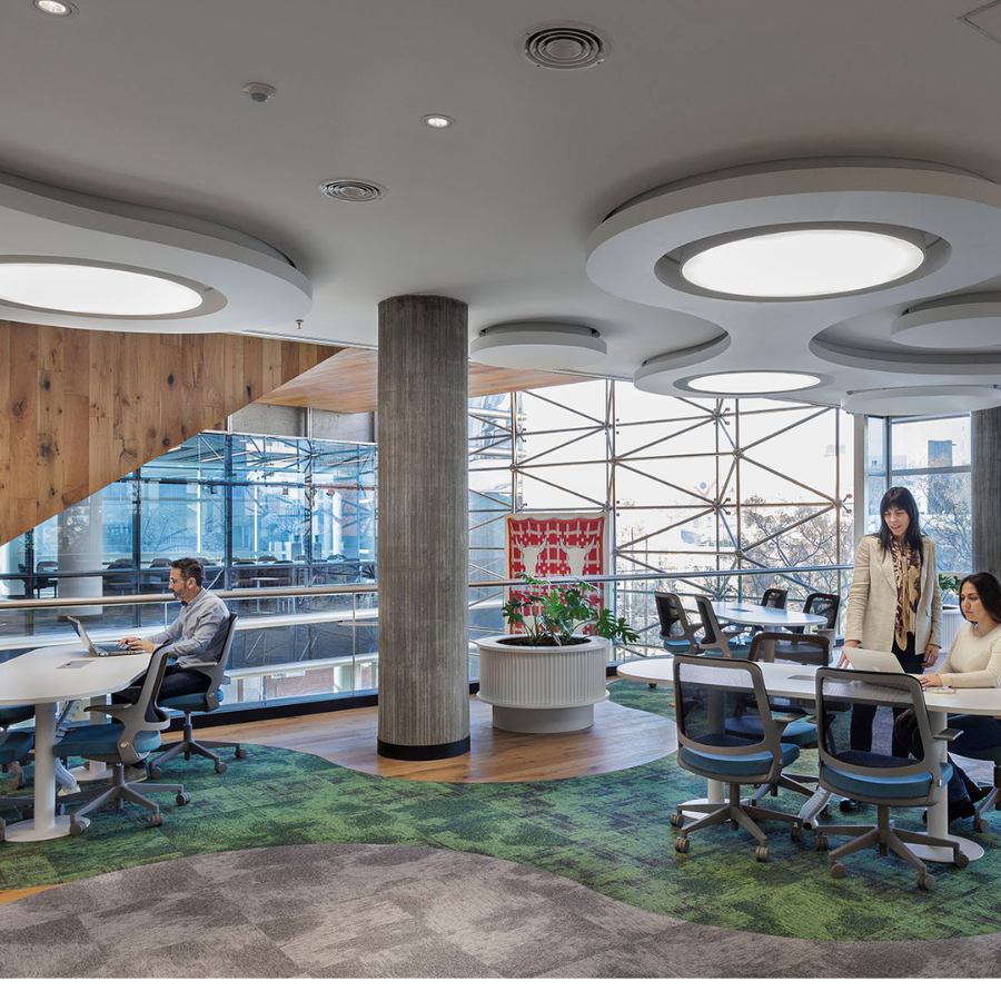 Cada piso se abre a este vacío a través de plazas o “ágoras”, concebidas como nodos de bienvenida que fomentan el encuentro, la integración y la colaboración informal. Alrededor de estas plazas se organizaron los espacios de trabajo, con mobiliario diverso agrupado en torno a un coffee point central, reforzando la idea de un entorno compartido y dinámico.