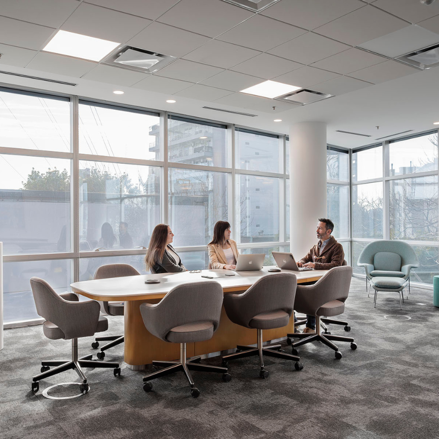 En los pisos superiores, las zonas operativas ocupan el centro de cada planta en disposiciones abiertas con islas de trabajo ergonómicas. Las salas de reunión —adaptadas a diversas modalidades laborales— se ubicaron sobre la medianera, junto con programas de soporte como lockers, depósitos, servidores y áreas de copiado.