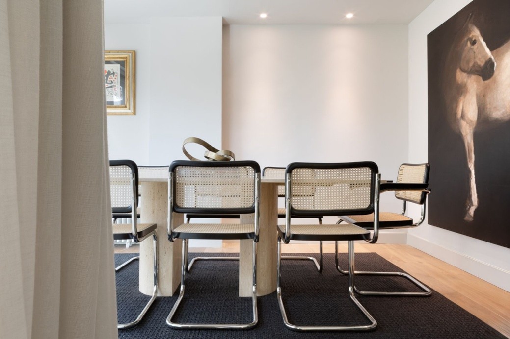 Junto a la terraza y al salón, unas cortinas de suelo a techo separan la estancia destinada al comedor. Está formado por una gran mesa rectangular de mármol travertino, que se completa con las icónicas sillas Cesca (diseño de Marcel Breuer, 1928) y descansa sobre una gran alfombra en un tono azul noche. Al fondo un cuadro tamaño XL de un caballo añade profundidad y descubre la sensibilidad por el arte de los propietarios.