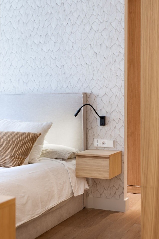 Cabe destacar el papel pintado como elemento clave en todos los dormitorios, actuando como recurso diferenciador y aportando carácter propio a cada uno de ellos. “Es una forma sutil de introducir carácter y personalidad sin sobrecargar”, explica Ingrid Matheu. Así, en uno de los baños ha optado por un diseño con motivos de peces que aporta un guiño lúdico y fresco; en un dormitorio juvenil, un patrón de cuadros de estética atemporal; en un dormitorio infantil, un delicado diseño con animalitos, que refuerza un ambiente tierno y acogedor…