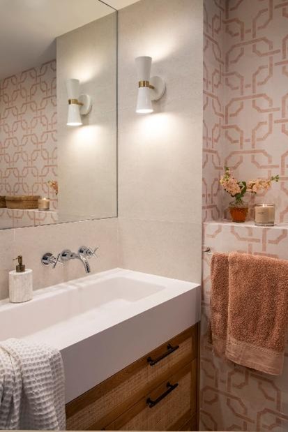El baño en suite mantiene el mismo suelo de madera natural que el resto de la casa. Para este espacio se ha diseñado un mueble a medida en madera y ratán, con encimera con faldón, doble seno y grifería empotrada. Todas las paredes están revestidas con papel pintado, lo que aporta una fuerte dosis de personalidad y coherencia estética.