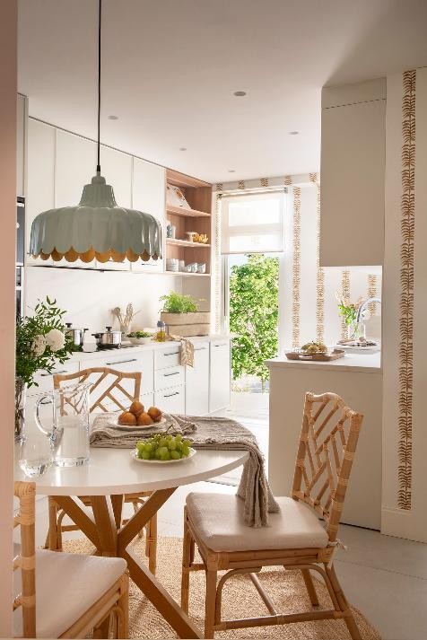 La cocina, cálida y luminosa, se viste con muebles en tonos neutros, que aportan serenidad y luminosidad. El toque especial lo pone un papel pintado de inspiración vegetal en tonos ocres, que reviste las paredes de la zona de office. Las sillas de ratán y una mesa redonda coronada por una lámpara colgante en un tono verde completan la escena, creando una atmósfera natural y acogedora.
