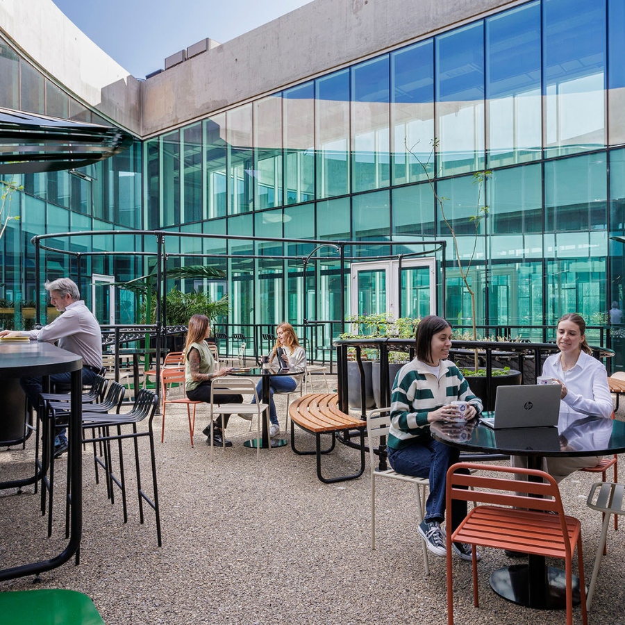En el centro se dispuso un conjunto de cápsulas ovaladas, que funcionan como salas de reunión, áreas de encuentro y phone booths. Organizarlas como un “bosque” de curvas crea un recorrido dinámico que desemboca en una gran cafetería conectada con un work café flexible, abierto hacia los patios internos del edificio.