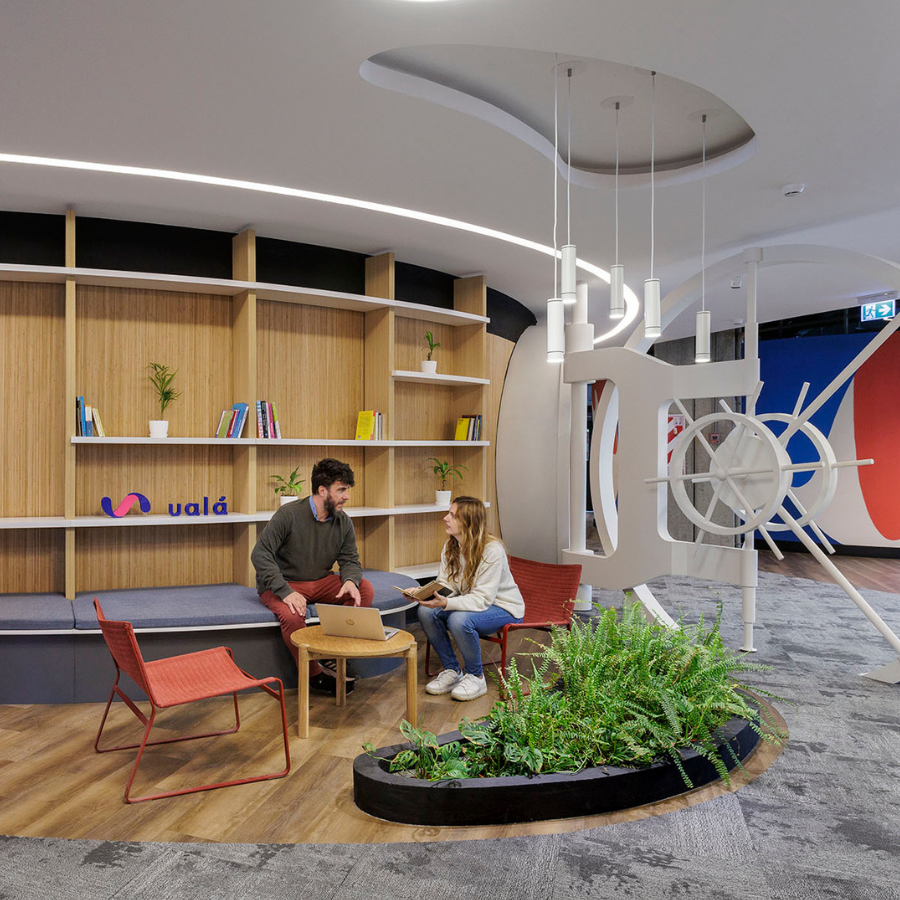 La bóveda, en cambio, está envuelta por una biblioteca circular, que destaca el valor que Ualá le otorga a la educación, la cultura y la formación continua.