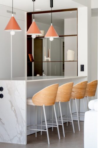 La cocina, con mobiliario en blanco, incorpora una isla en piedra sinterizada con cascada y sillas altas. Este mismo material se ha utilizado, como ejercicio de coherencia y armonía estética, en el diseño a medida de un mueble que añade almacenamiento en el salón.