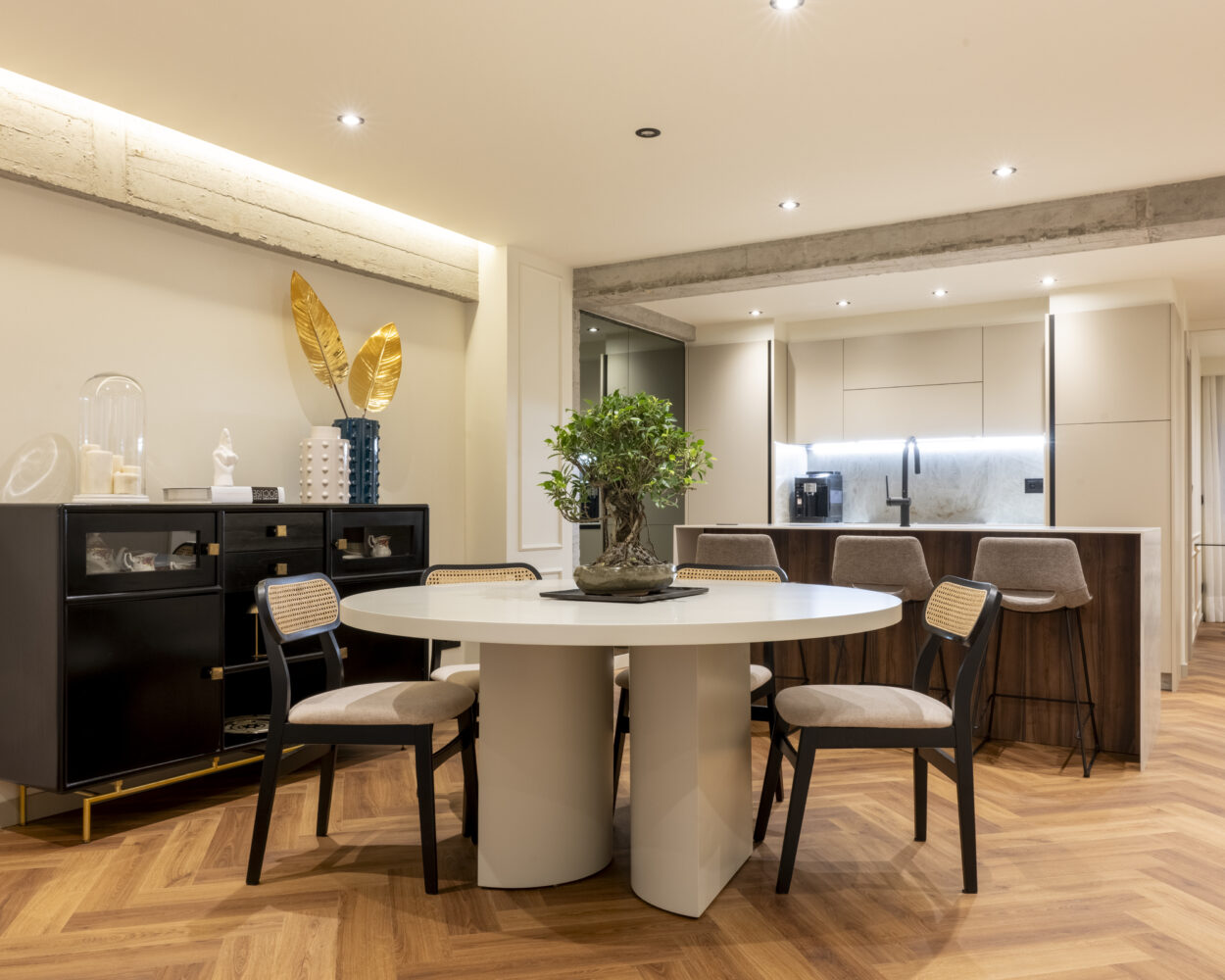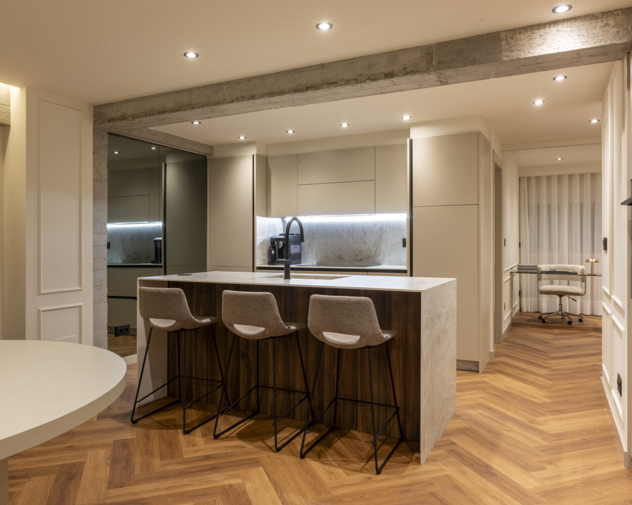 La nueva vivienda apuesta por un concepto open space donde cocina, comedor y salón conviven en armonía visual y funcional. Las vigas originales han sido descubiertas y tratadas en hormigón visto, aportando un guiño industrial que contrasta —y al mismo tiempo convive— con molduras clásicas en paredes, iluminación indirecta en foseados LED, y una paleta de carpinterías en beigue que transmite serenidad.