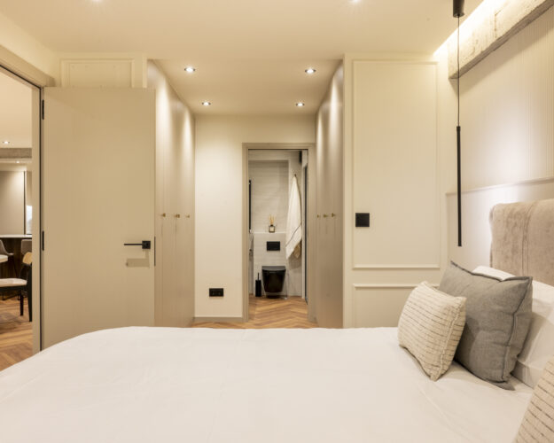 El nuevo programa incluye dos dormitorios, dos baños (uno en suite), vestidor y un despacho que se integra con discreción y elegancia al espacio común, gracias a un escritorio de cristal que aporta ligereza sin perder presencia. La vivienda ahora fluye, se adapta y seduce. Es un hogar pensado para vivirlo intensamente, sin renunciar al diseño.