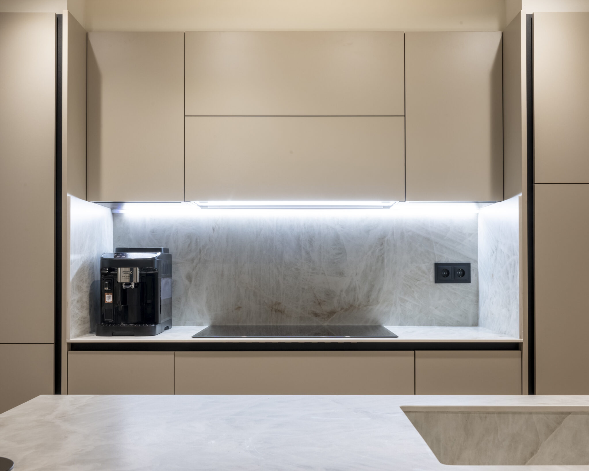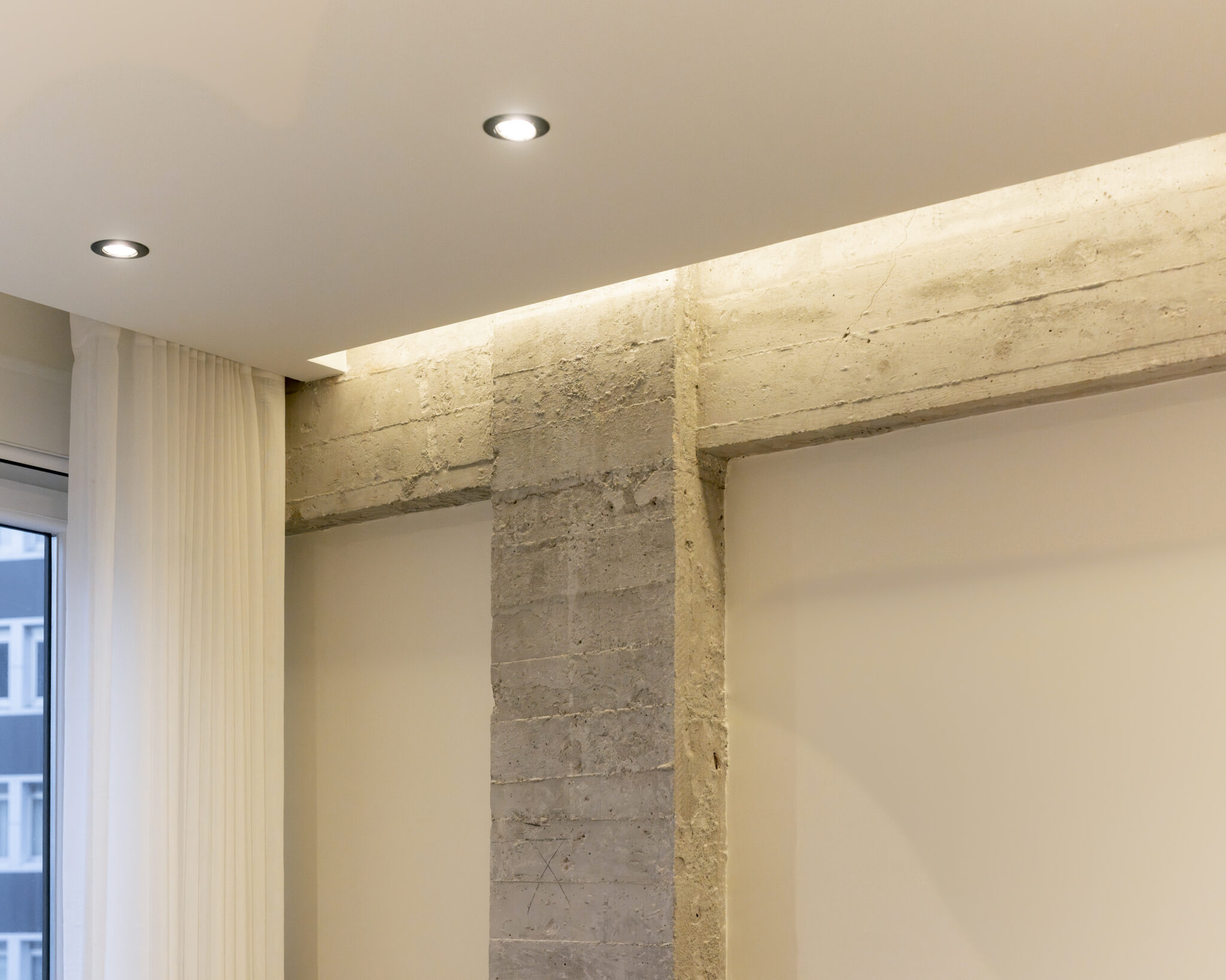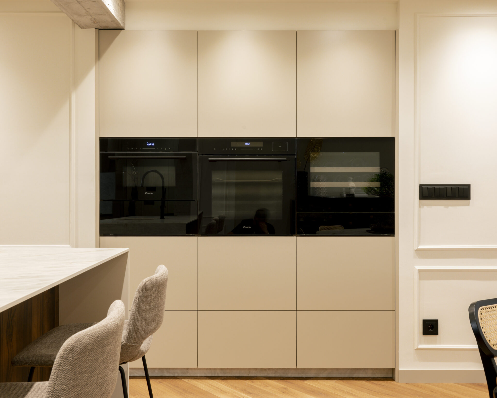 La nueva vivienda apuesta por un concepto open space donde cocina, comedor y salón conviven en armonía visual y funcional. Las vigas originales han sido descubiertas y tratadas en hormigón visto, aportando un guiño industrial que contrasta —y al mismo tiempo convive— con molduras clásicas en paredes, iluminación indirecta en foseados LED, y una paleta de carpinterías en beigue que transmite serenidad.