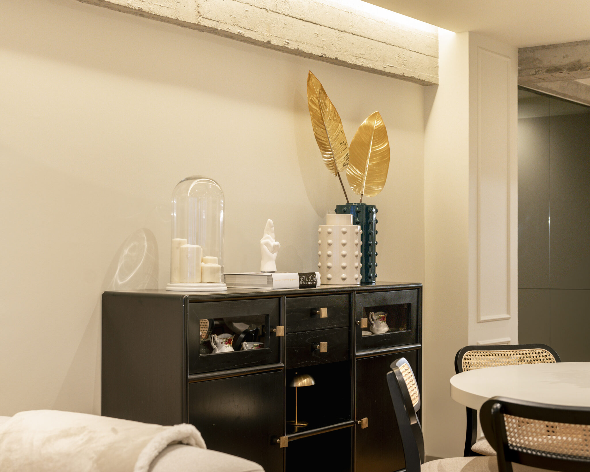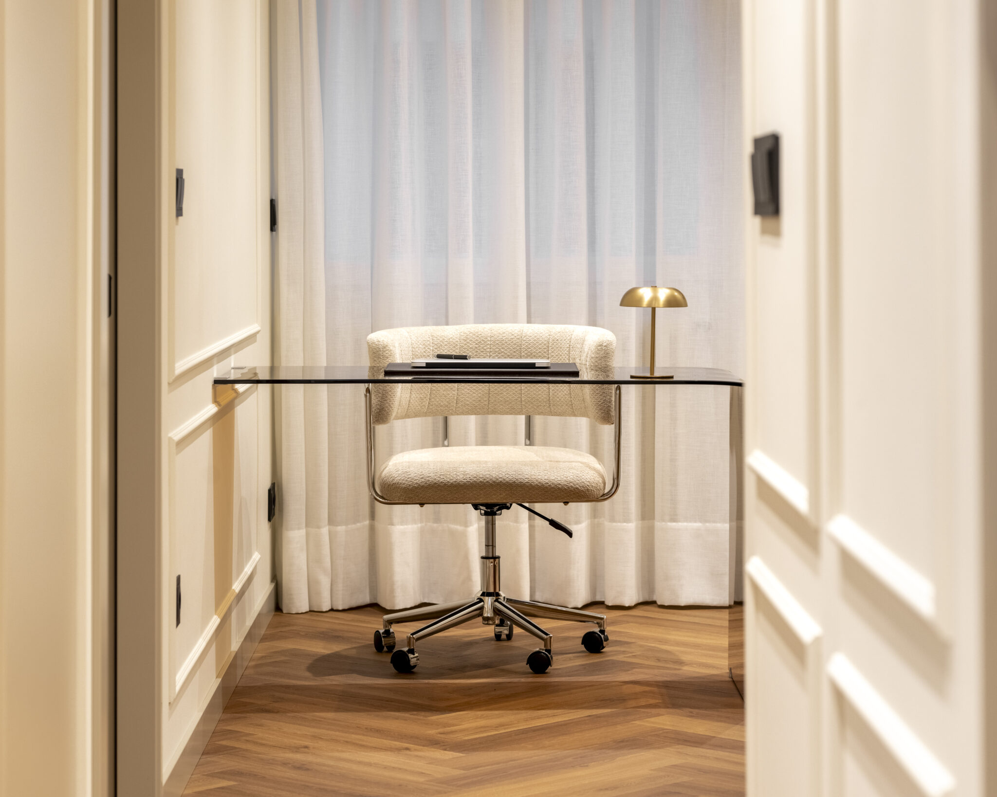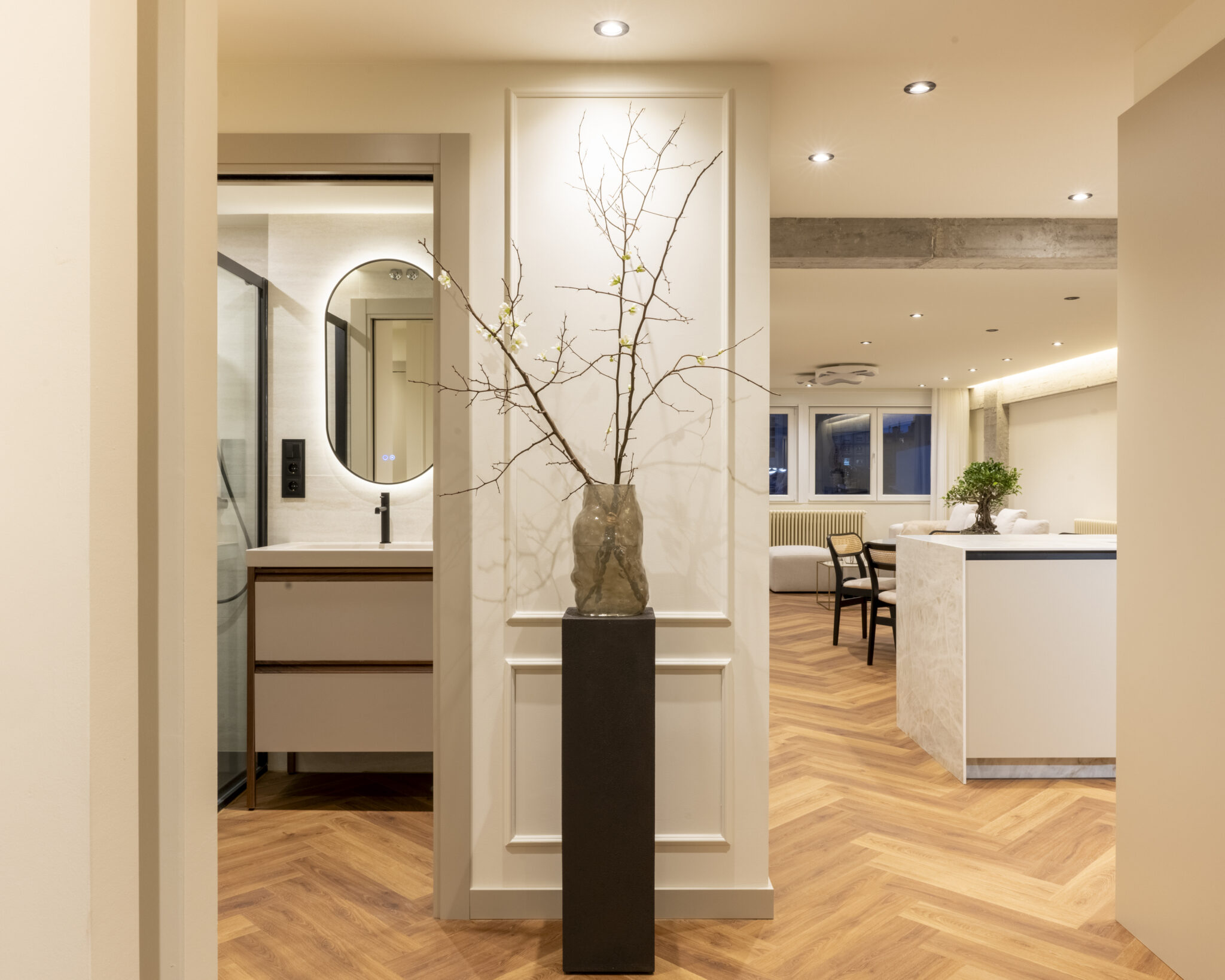 El nuevo programa incluye dos dormitorios, dos baños (uno en suite), vestidor y un despacho que se integra con discreción y elegancia al espacio común, gracias a un escritorio de cristal que aporta ligereza sin perder presencia. La vivienda ahora fluye, se adapta y seduce. Es un hogar pensado para vivirlo intensamente, sin renunciar al diseño.