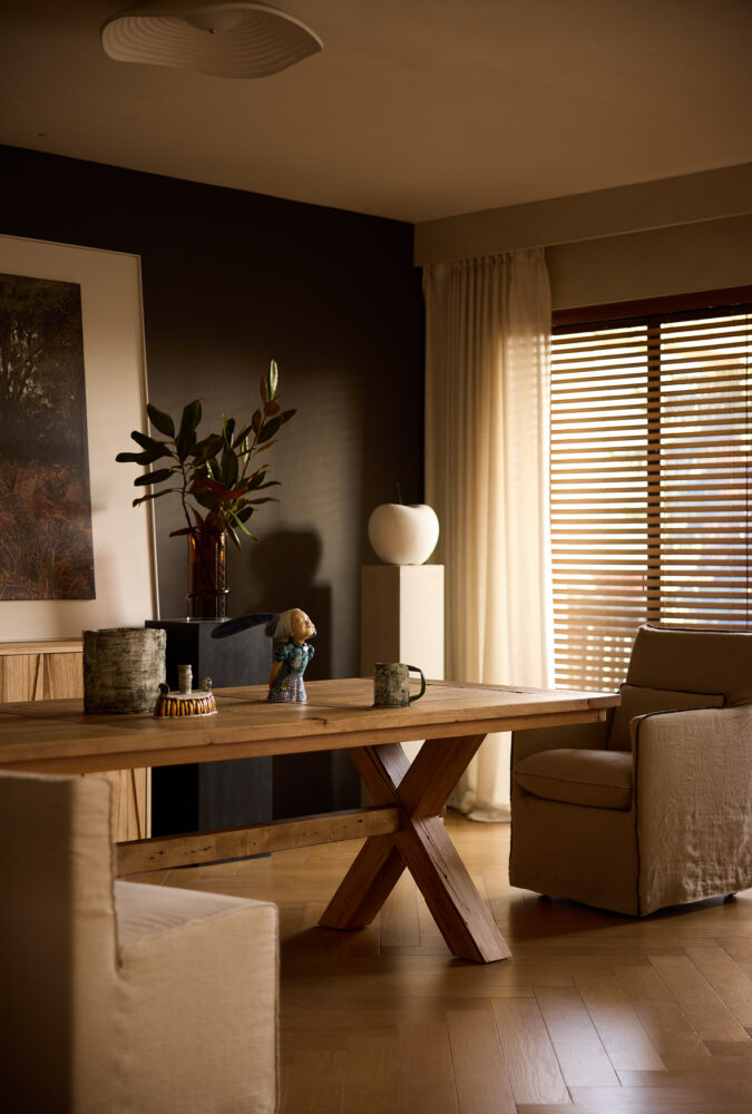 Las maderas claras conviven con maderas más oscuras, creando capas y pausas. Algunos gestos artísticos puntuales —pequeñas desviaciones— mantienen flexible el orden y permiten que el espacio siga vivo.