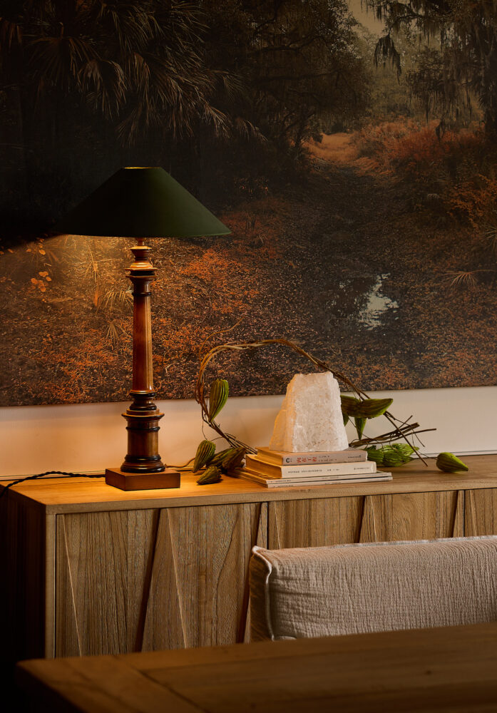 Un cuadro en la pared muestra un sendero estrecho que atraviesa un bosque antiguo: tenue, levemente melancólico, pero sincero. Con el paso del tiempo conserva una gravedad silenciosa, preservando una belleza cruda, sin pulir.
