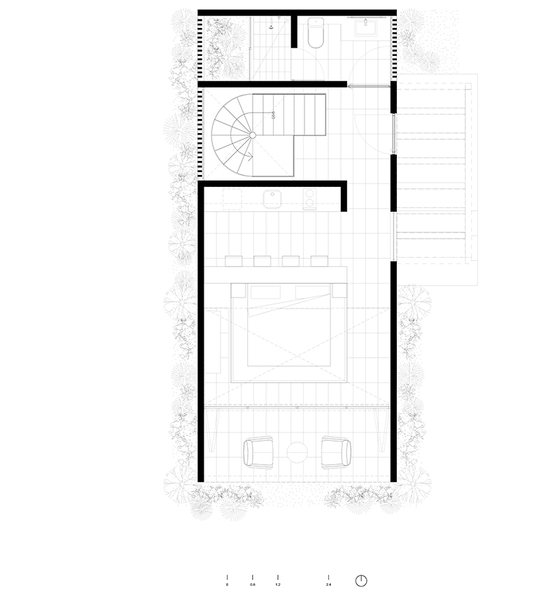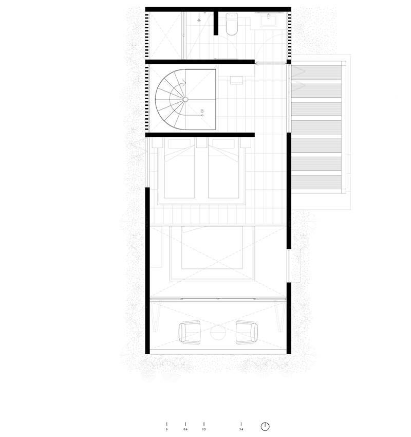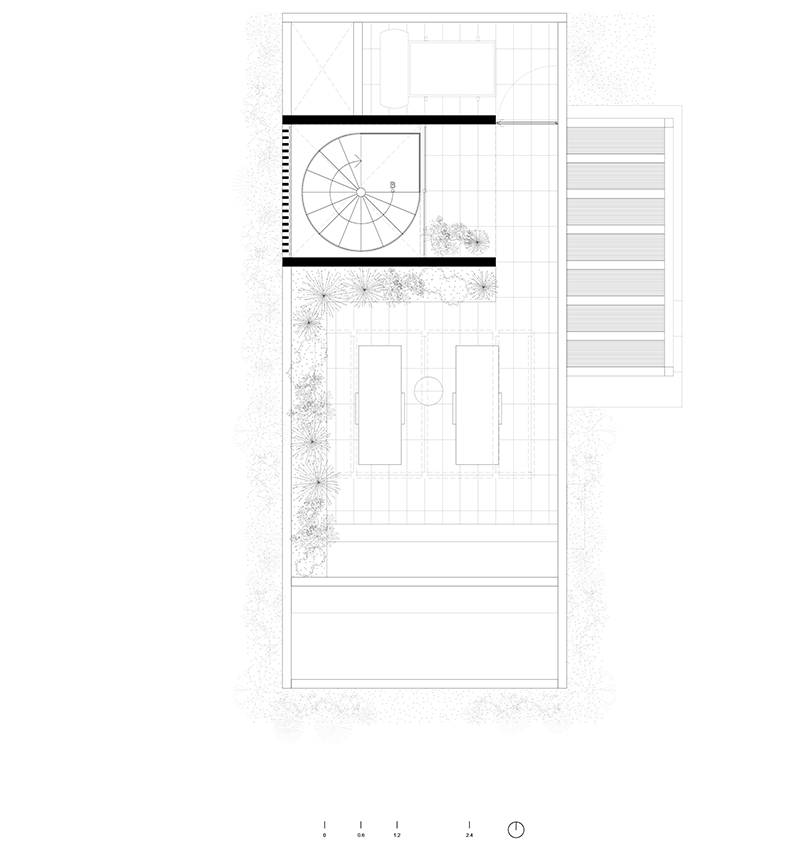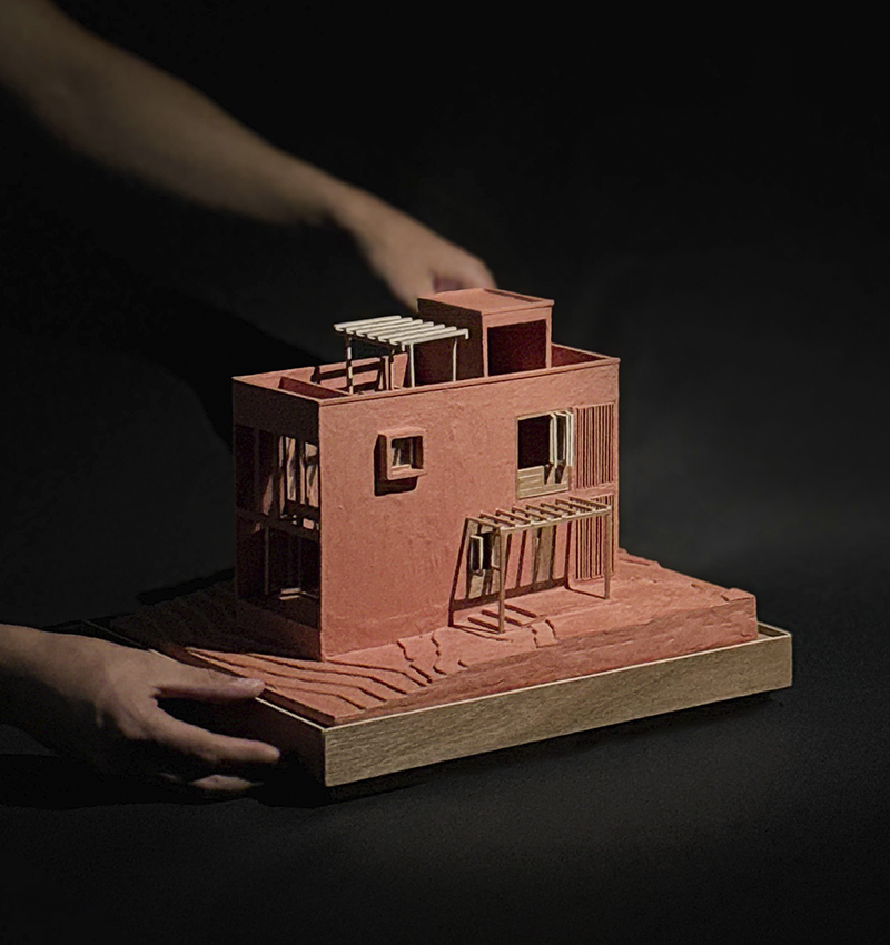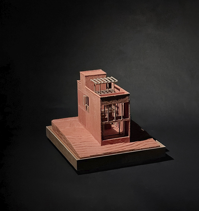 Una retícula estructural precisa se contiene dentro de muros de tierra compactada, cuya presencia material y masa térmica evocan las dunas circundantes, al tiempo que mejoran el confort interior. La orientación, las celosías y los vacíos regulan la luz, las vistas y la privacidad, mientras el programa se desarrolla verticalmente y culmina en una terraza en la azotea abierta hacia el horizonte.