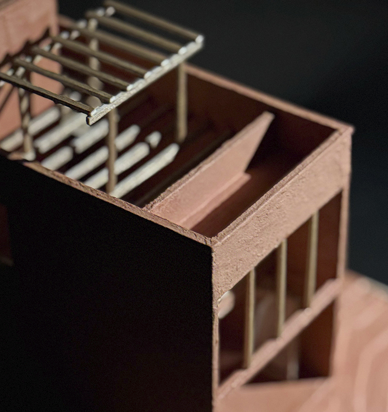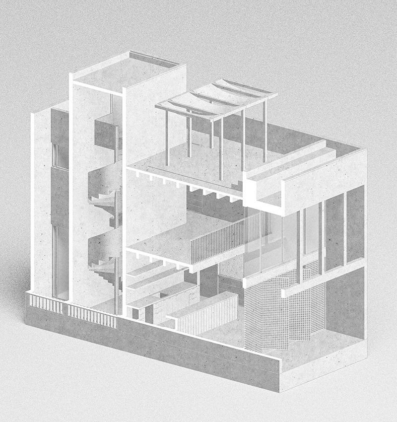 Una retícula estructural precisa se contiene dentro de muros de tierra compactada, cuya presencia material y masa térmica evocan las dunas circundantes, al tiempo que mejoran el confort interior. La orientación, las celosías y los vacíos regulan la luz, las vistas y la privacidad, mientras el programa se desarrolla verticalmente y culmina en una terraza en la azotea abierta hacia el horizonte.