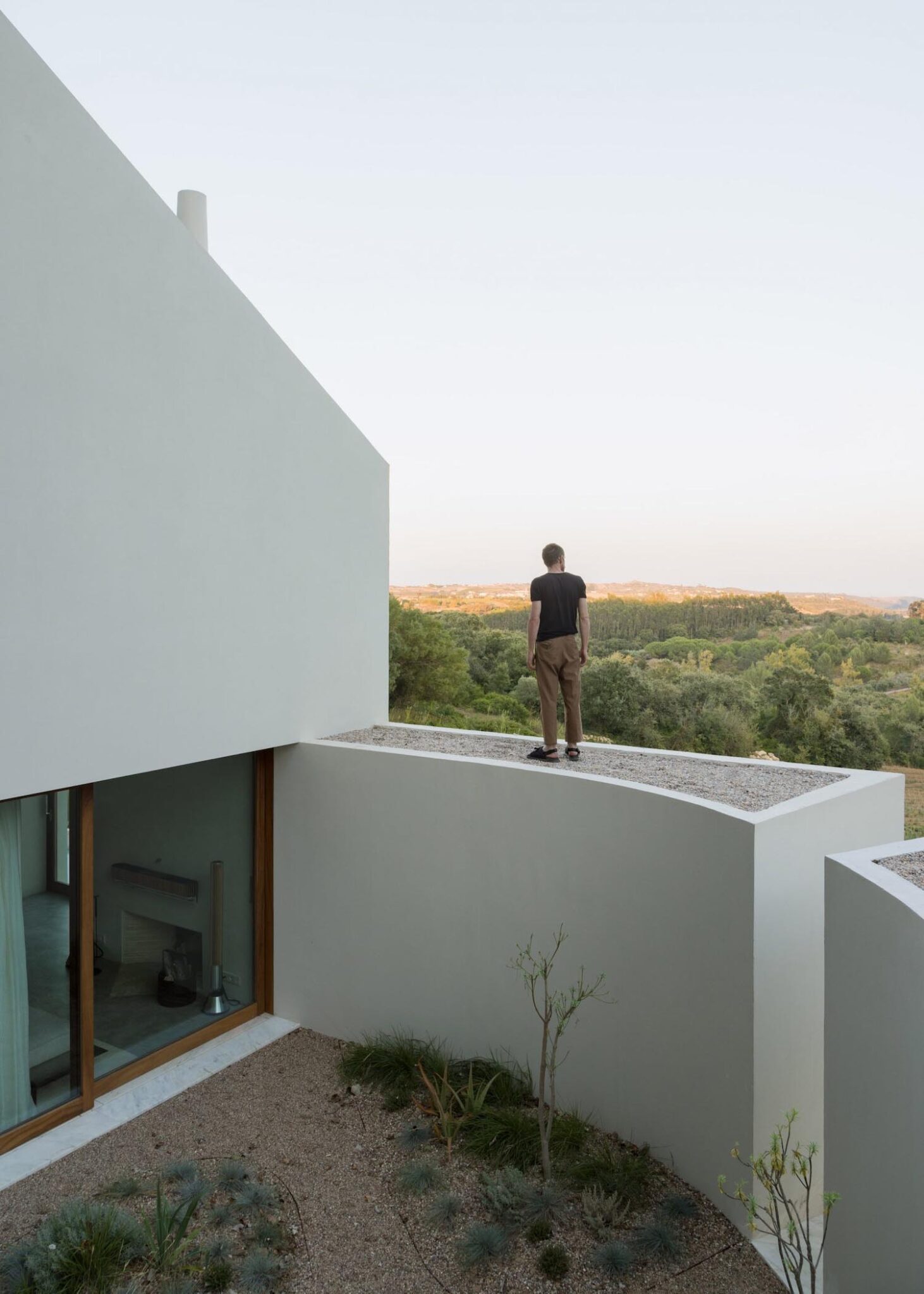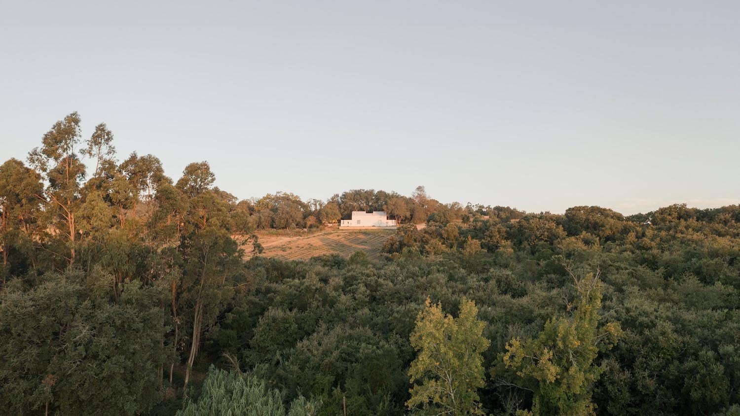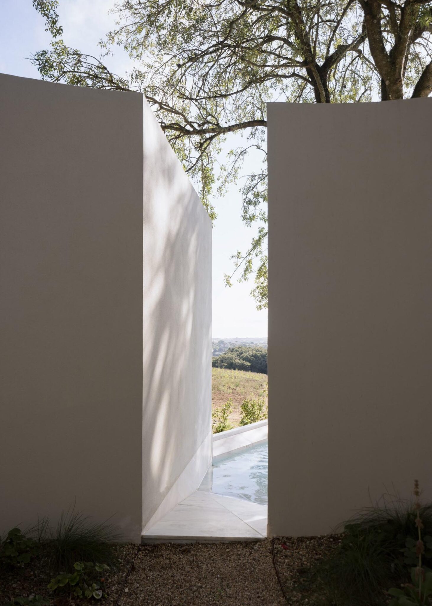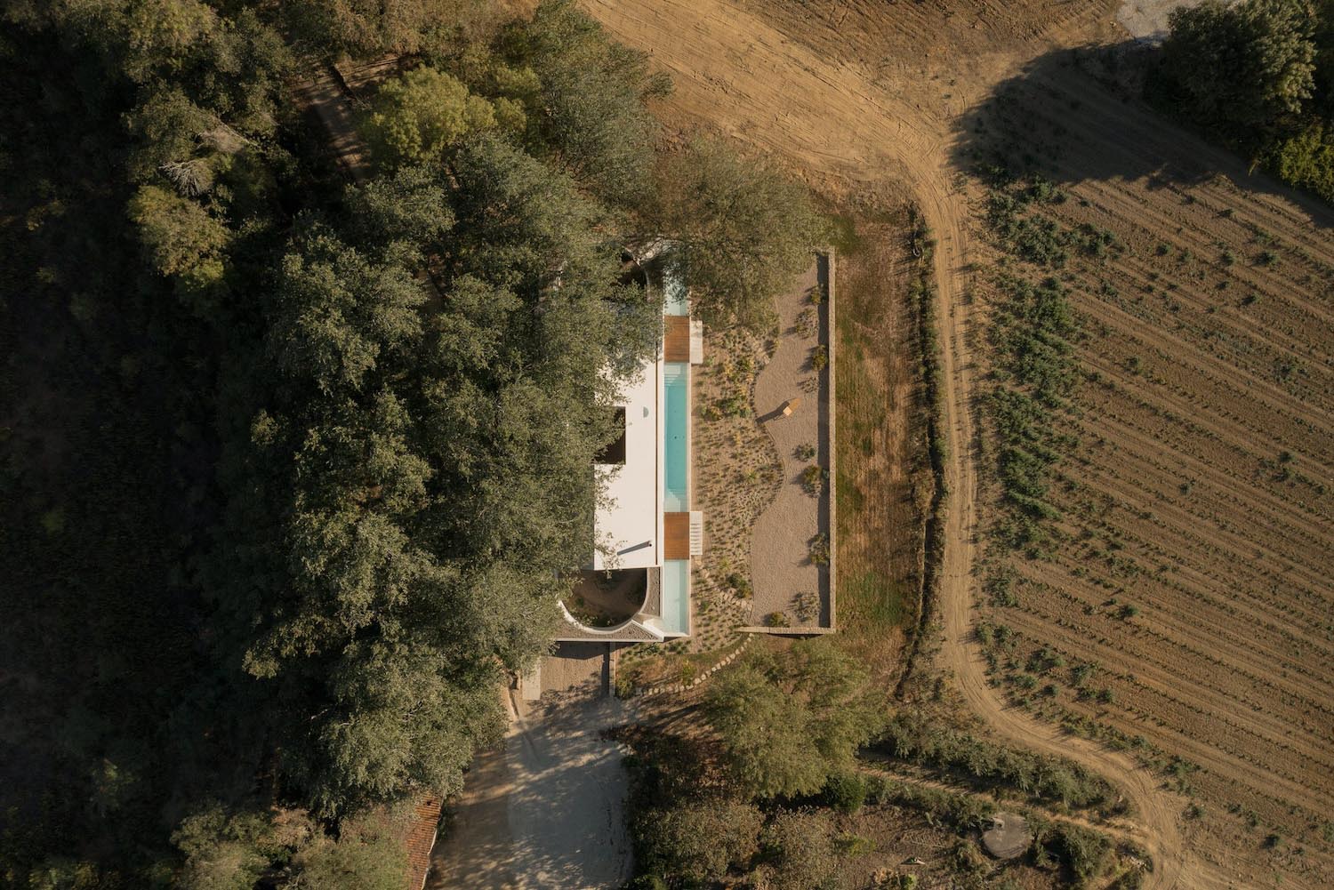 Hacia el sur, Quinto do Álamo se levanta con autoridad sobre un podio, que le permite dominar el paisaje circundante, estableciendo una jerarquía sobre las 50 hectáreas de viñedos que la rodean. Este zócalo asienta la construcción frente a la pendiente y remata la composición con una piscina oblonga y estrecha; un remate visual para la monumental masa de la casa, que proyecta la mirada hacia el horizonte de Alenquer.