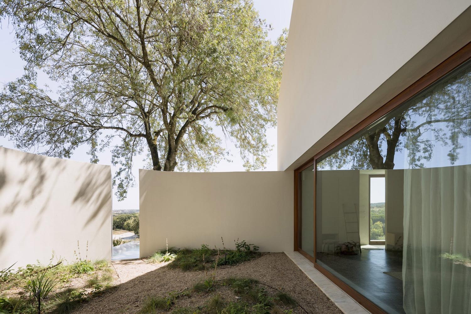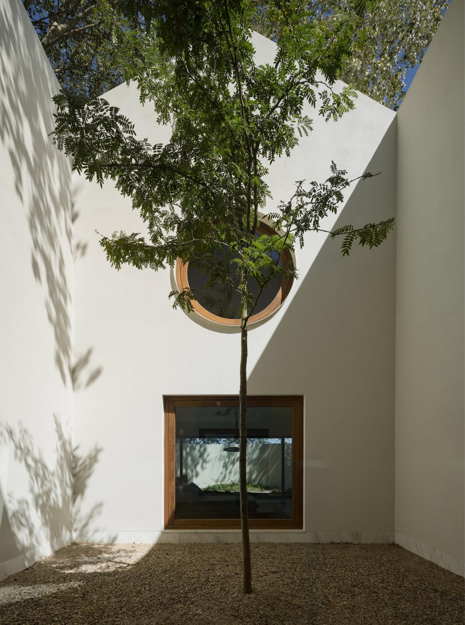 Es en estos intersticios donde la domesticidad florece con una poética compleja.En la zona de abajo se hallan las áreas comunes y el dormitorio, articulados por un tercer patio que sirve de pulmón de luz y silencio. No obstante, la verdadera alma de Quinta do Álamo se sitúa arriba, donde la geometría se vuelve explícitamente sinuosa y revela la identidad profesional de los propietarios.Aquí,los muros perimetrales son de un grosor deliberado, ya que ejercen como frontera térmica y acústica, vital para el ejercicio musical. Esta decisión se puede entender como una reinterpretación de las paredes originales que daban protección térmica al vino que allí se guardaba.