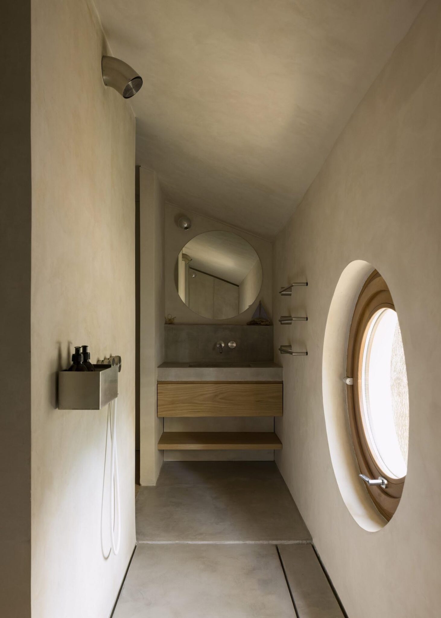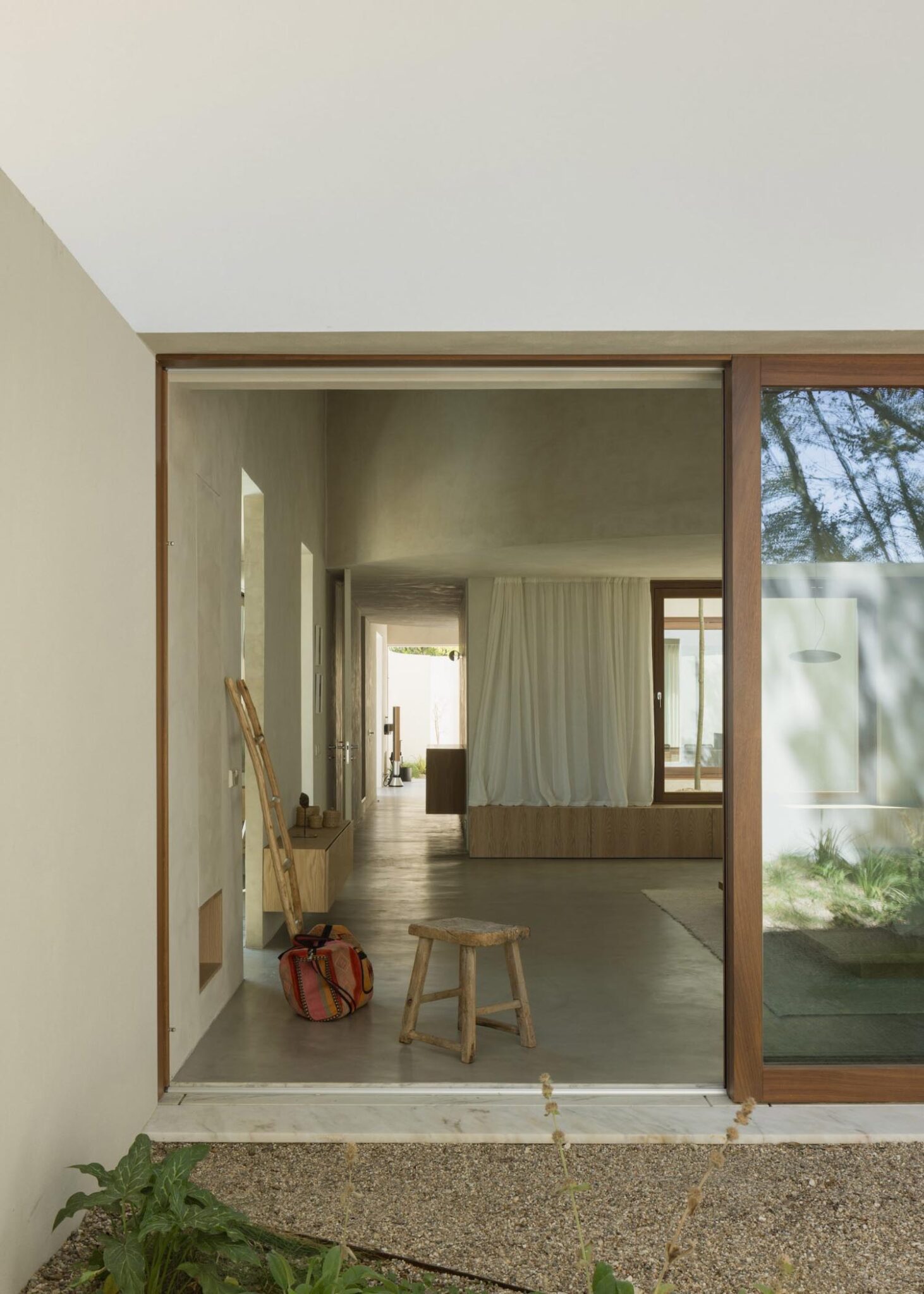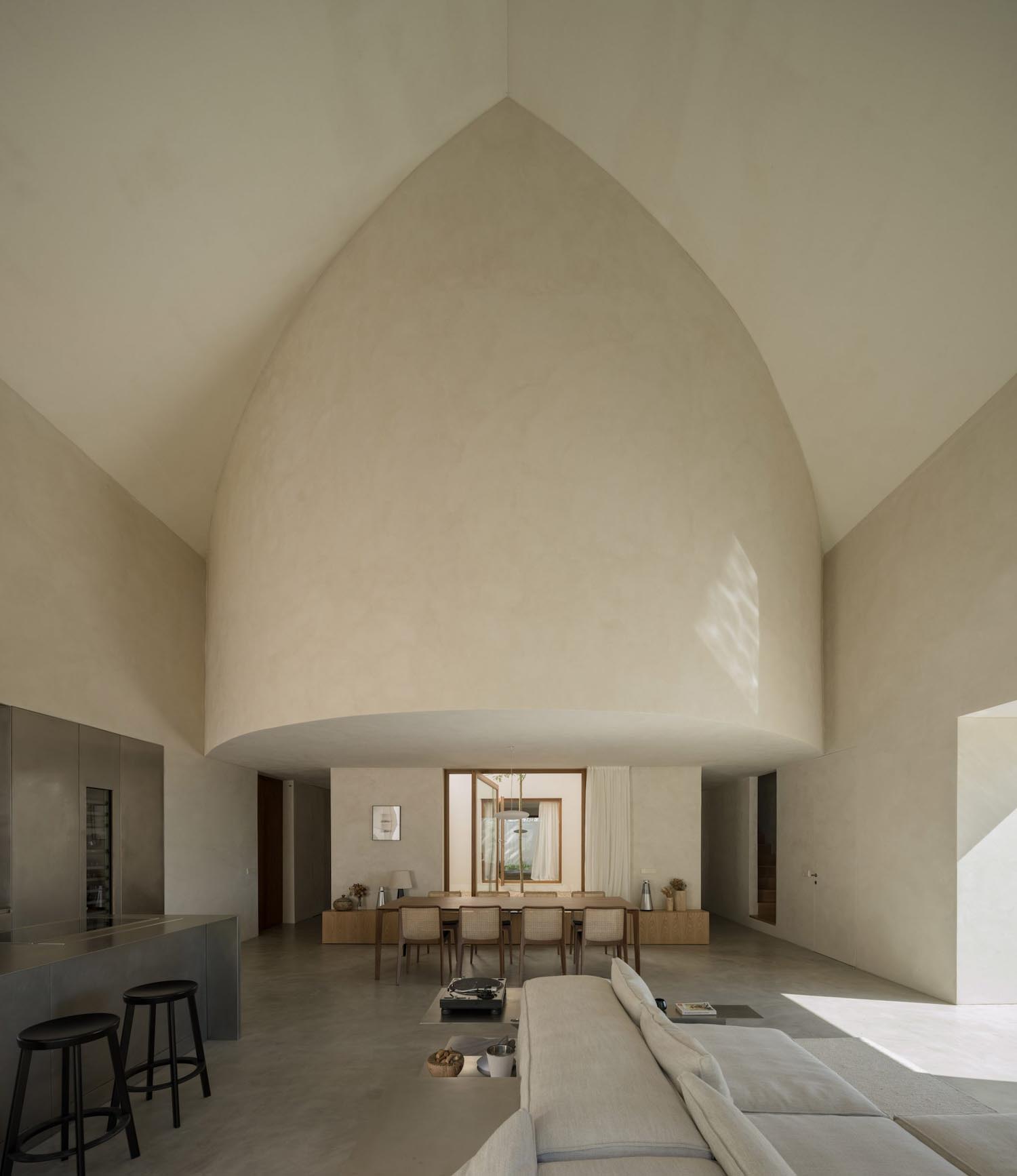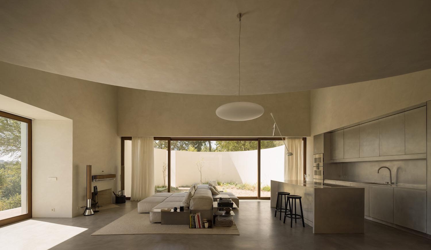 Se podría decir que dicho muro perimetral es un “mueble” en sí mismo, que oculta la cocina, la chimenea y almacenamiento, dejando las habitaciones principales totalmente libres de ruido visual. Al esconder lo cotidiano, Arnone hace que la arquitectura sea, ante todo, un vacío disponible para la creación; un entorno minimalista y ordenado y que se envuelve en un yeso de tono pálido para unificar superficies y techos.
