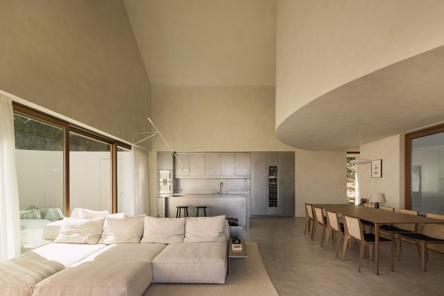 Matteo Arnone ha introducido unos patios semicirculares que bañan de fulgor cenital las estancias y eliminan las esquinas abruptas, favoreciendo una fluidez que disuelve la separación física para crear rincones de privacidad. En el nivel superior, los estudios de grabación circulares se elevan para asomarse al patio central con ventanas tipo ojo de buey. Desde abajo, la vista de estas salas curvas genera una curiosidad sutil sobre el proceso creativo; un misterio que refuerza la idea de la casa como refugio secreto.