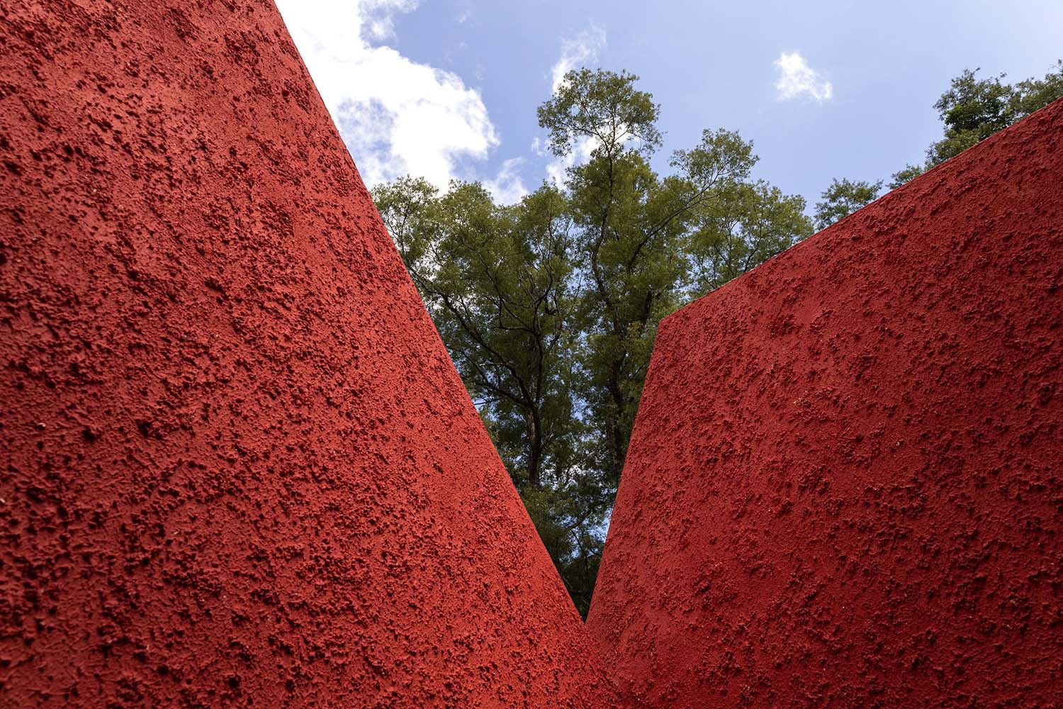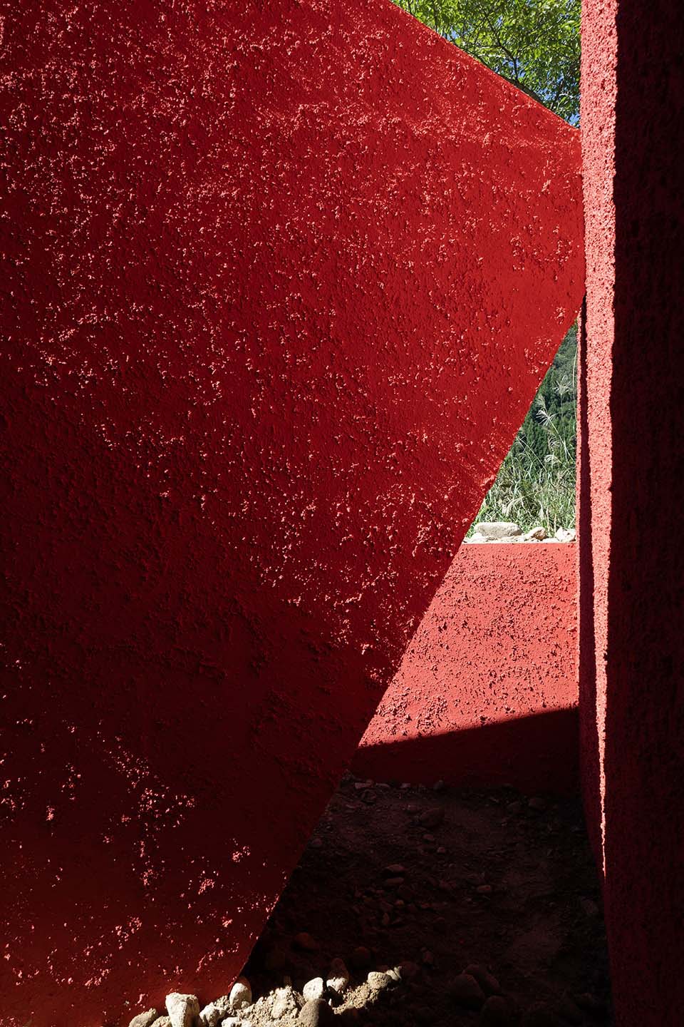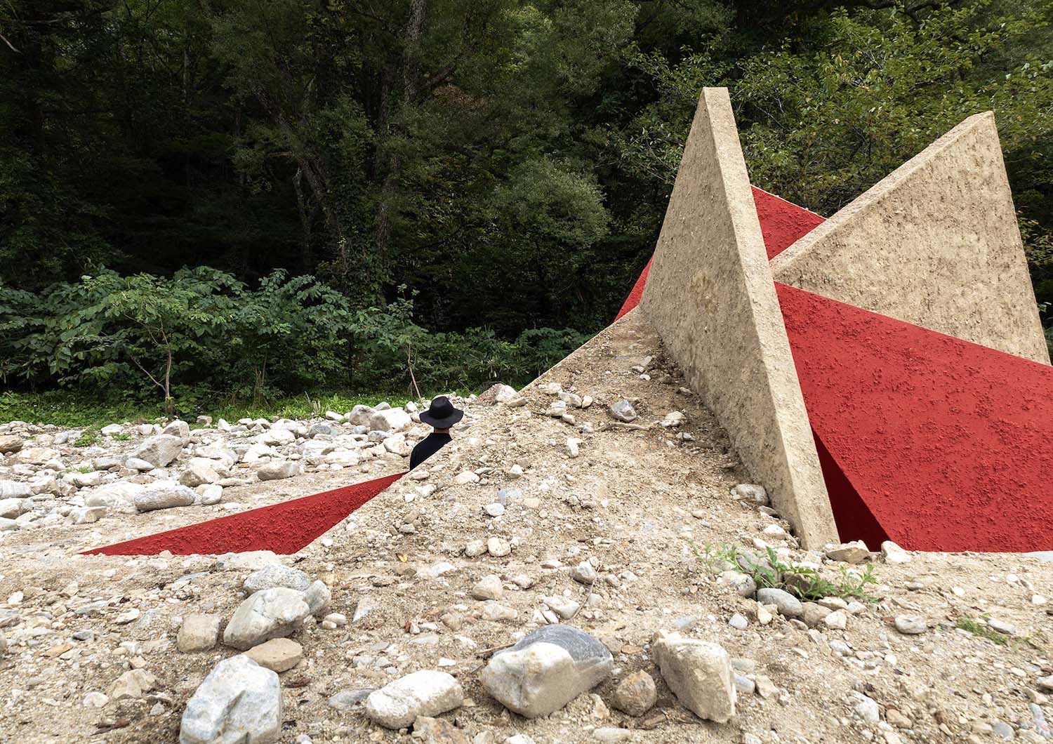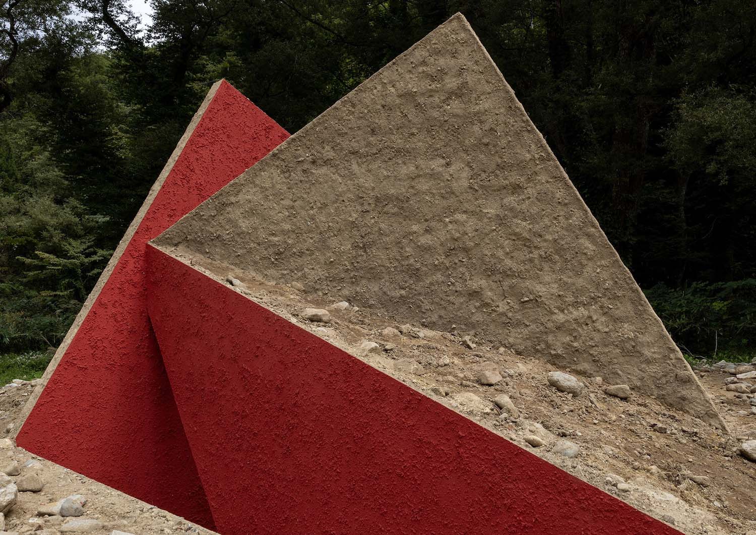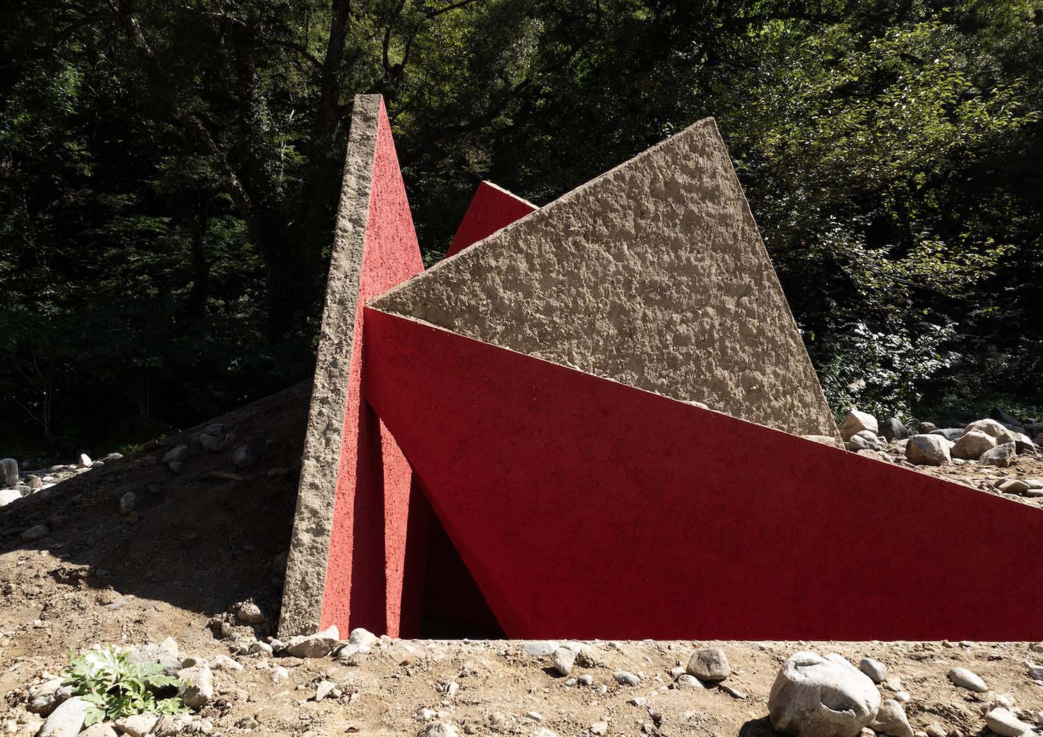 Shrine of Triskele emerge entre montañas y ríos como una figura en movimiento donde los materiales respiran al ritmo del enclave. Ubicada en Toga, una localización no azarosa, la orografía que la rodea es inseparable de la pieza. La propuesta, definida como meditative land art, guarda cierta relación con otras experiencias japonesas donde la integración con la naturaleza, la contemplación y la mutabilidad construyen su significado. La obra se articula mediante un armazón triangular rojizo, parcialmente cubierta por la tierra circundante, lo que genera un recorrido sensorial con múltiples accesos y salidas. Su forma tridimensional de triskele funciona como símbolo de equilibrio y movimiento perpetuo.