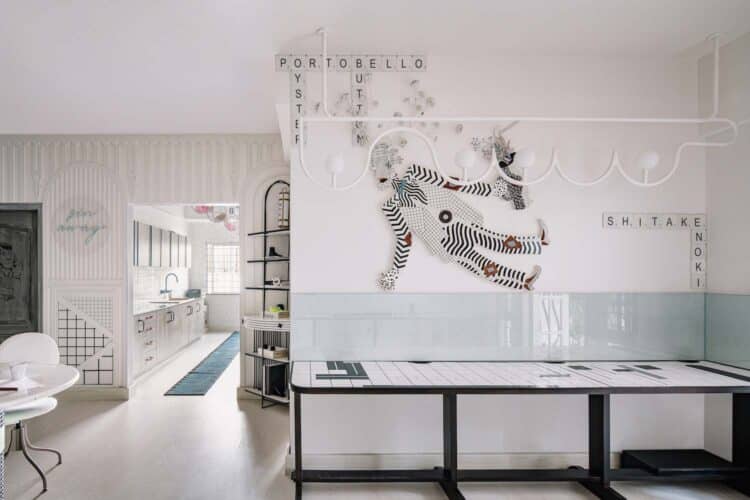 Usando el blanco y el negro como base, las posibilidades que ofrecen las pinceladas verde flúor, azul o rosa resultan infinitas en una oficina de 93 m2. Personajes circenses con contorsiones imposibles, caricaturas grafiteadas en la pared y mensajes como “Stay Weird” o “Sometimes I Was Normal” constituyen al completo la personalidad de MOS. Además, cada una de estas originales piezas guarda una historia particular. Los elementos que conforman todas estas pequeñas y grandes esculturas nacen de propuestas pasadas, por lo que el reciclaje está también muy presente en su discurso. En este juego anárquico de estampados y texturas quedan representados variedad de estilos y modas, como el otaku, el neofuturista, el Memphis o el victoriano, que enriquecen todavía más esta propuesta experimental.