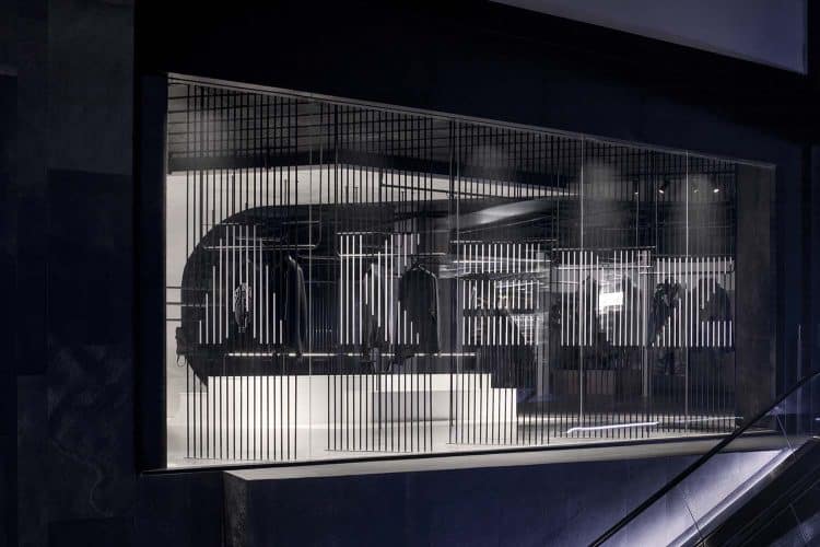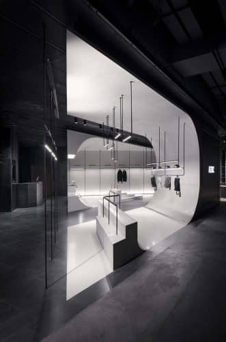 En el primero, el juego entre vertiginosas líneas curvas y rectas y la oscuridad frente al blanco de las pendientes llama la atención. Es un planteamiento elegante que traslada al visitante a un escenario frío e incluso misterioso: un clima dramático que se quiebra a través de los colores, la disposición y la organicidad de los artículos que se exhiben por todas las perchas y baldas.