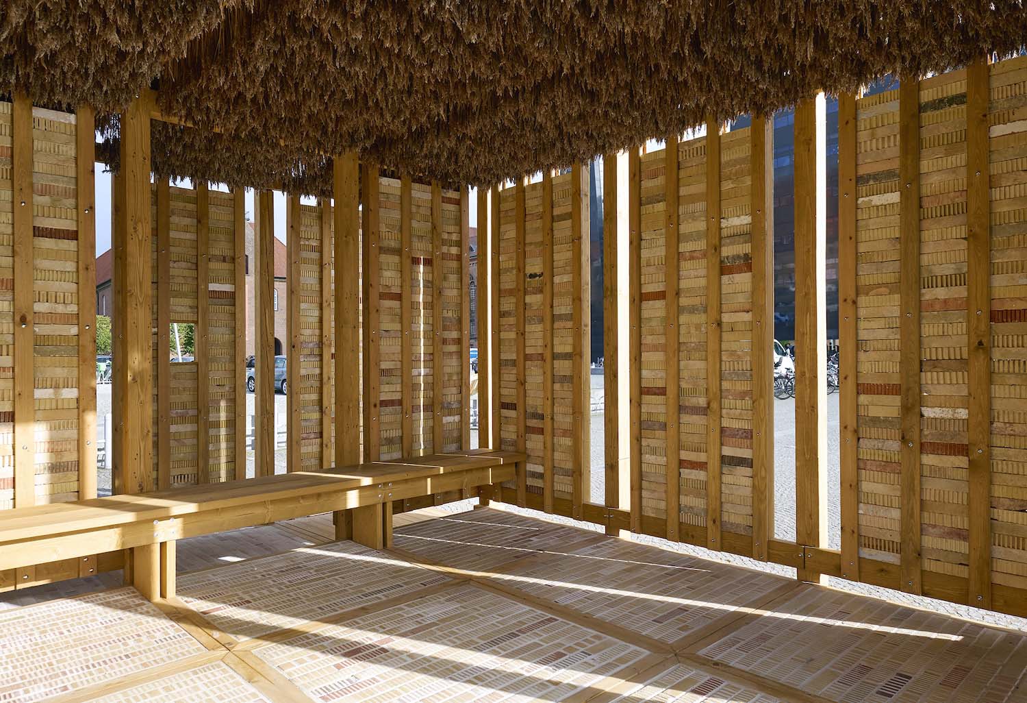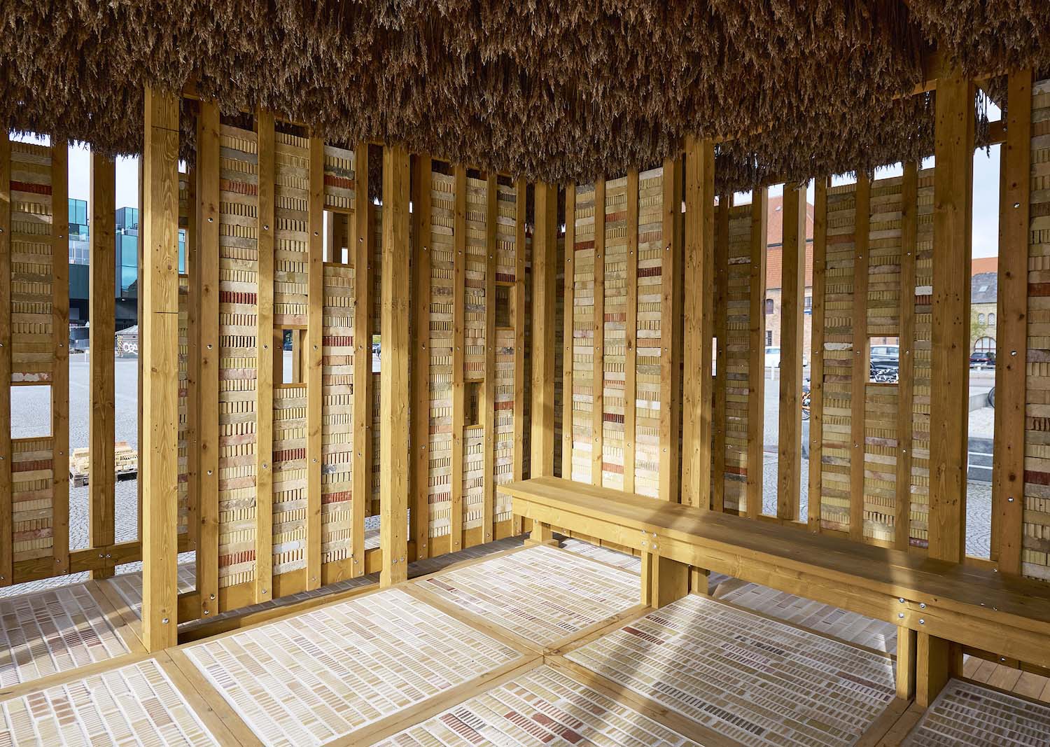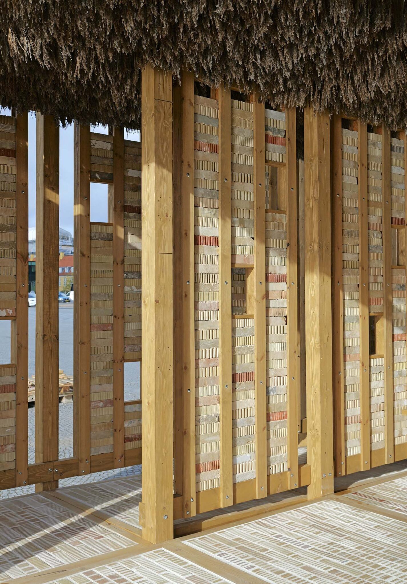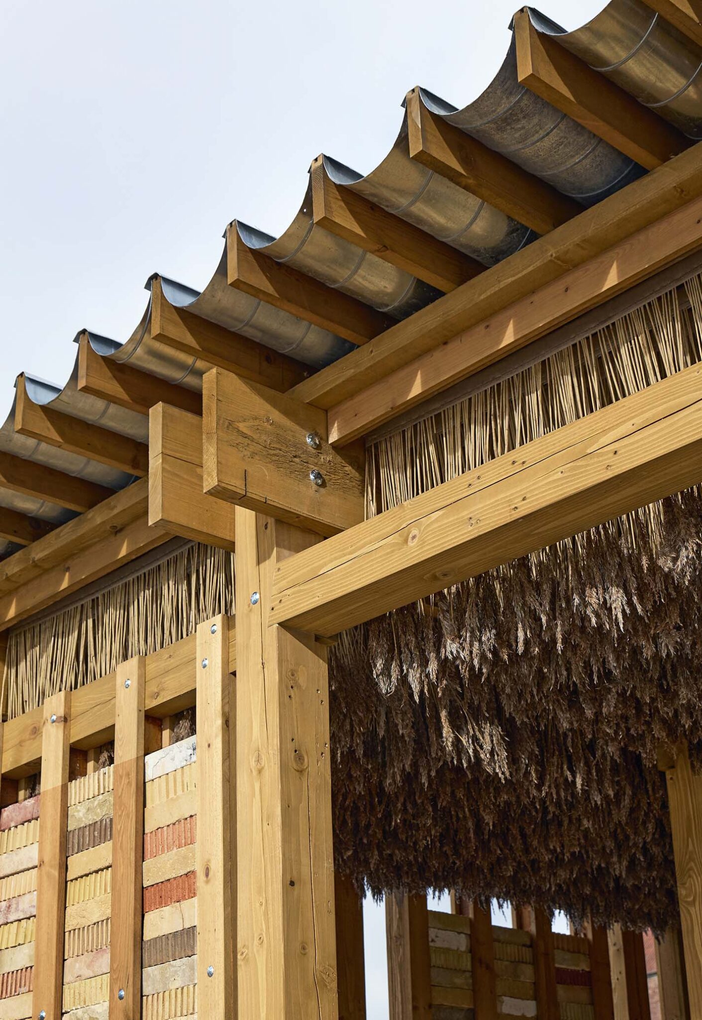 Por su parte, Slaatto Morsbøl es una joven pareja de arquitectas danesas que ha realizado un estudio minucioso de algunos recursos de construcción, con el fin de exponerlos concibiendo los cerramientos de su pabellón. Ladrillos, tuberías o los juncos para las cubiertas se presentan diseccionados y encajados entre los marcos de los entramados de madera que componen la estructura de esta pequeña edificación. La industria de la construcción, bien sujeta y enseñando las tripas, queda atrapada en una jaula de artesanía. Unos intestinos que, cuando se miran de cerca, no están hechos más que de cañas y de barro, y que nos hace pensar que el futuro está más cerca de lo que pensábamos del punto de partida. ¿Están el Arts and Crafts más vivo de lo que parece?