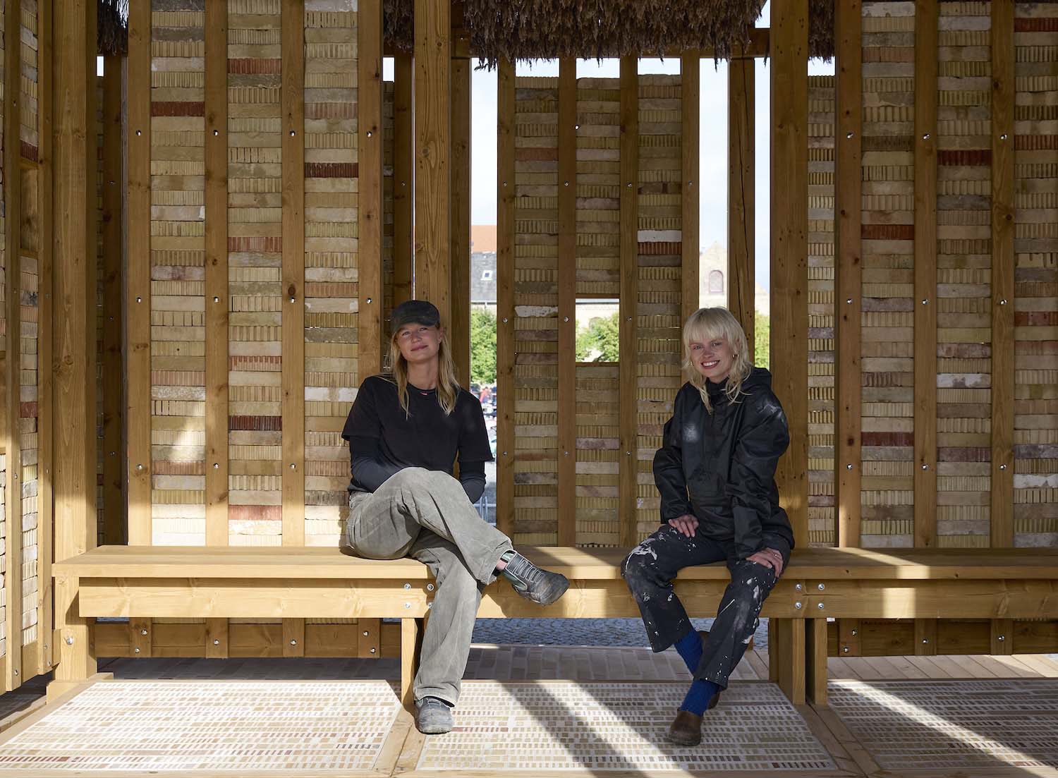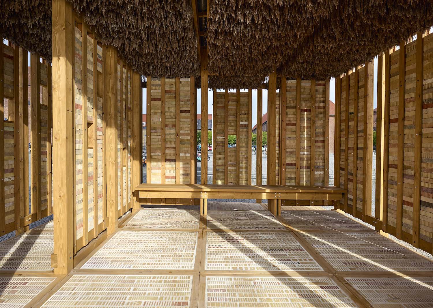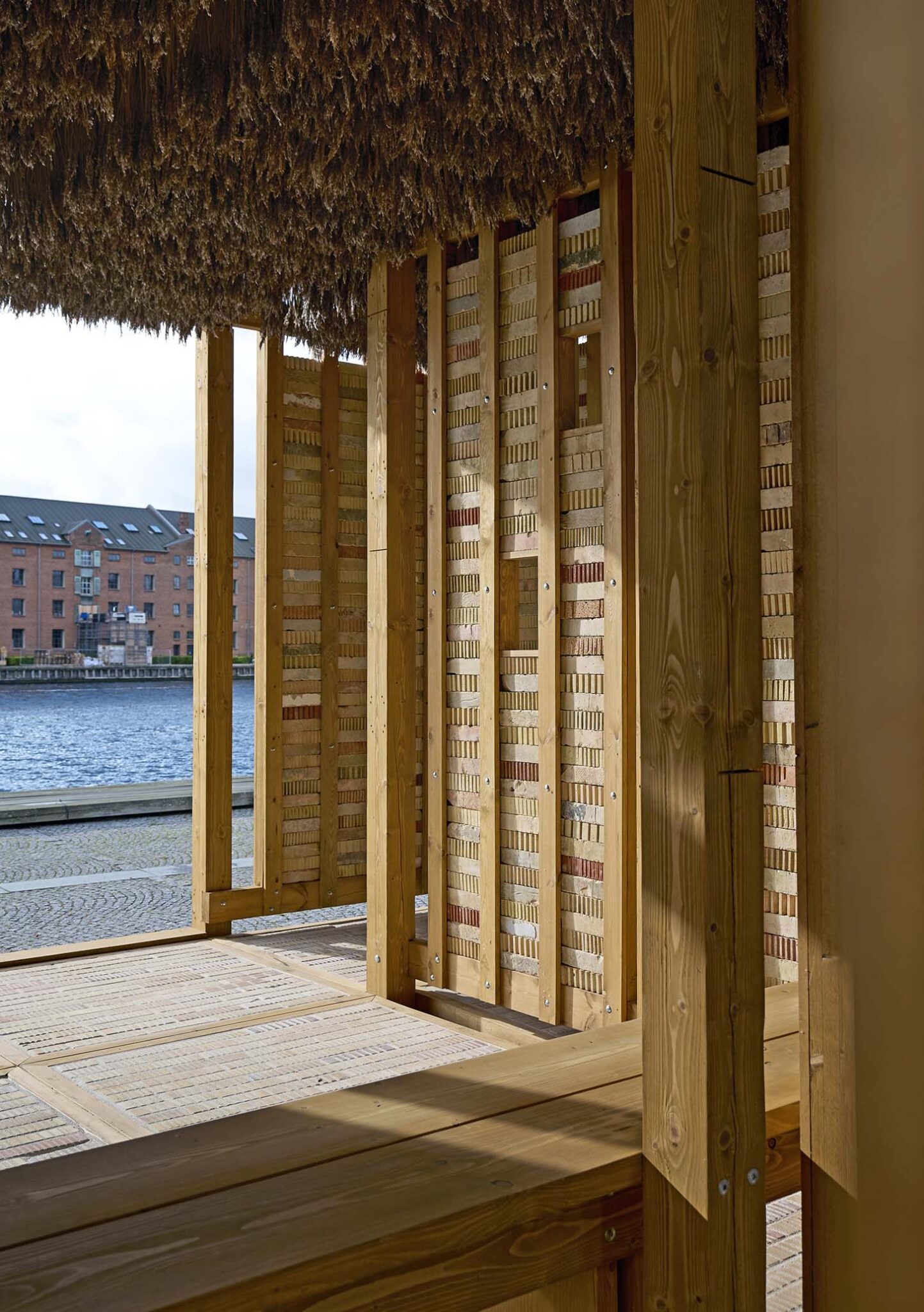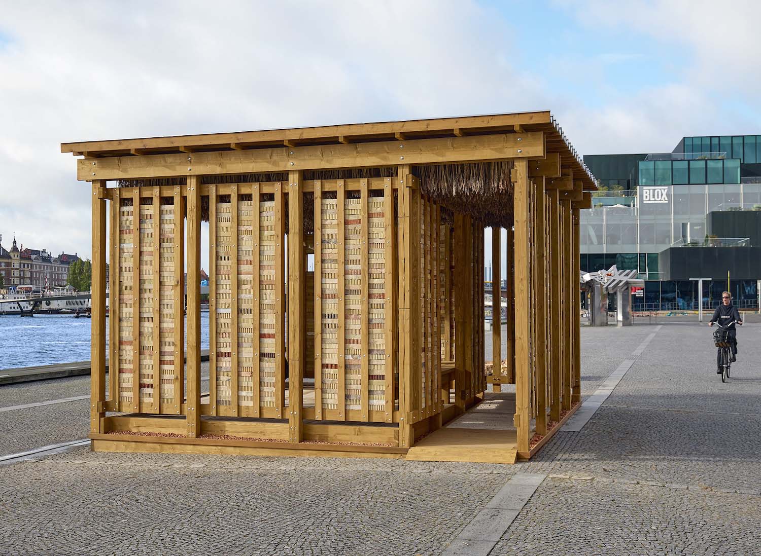 Por su parte, Slaatto Morsbøl es una joven pareja de arquitectas danesas que ha realizado un estudio minucioso de algunos recursos de construcción, con el fin de exponerlos concibiendo los cerramientos de su pabellón. Ladrillos, tuberías o los juncos para las cubiertas se presentan diseccionados y encajados entre los marcos de los entramados de madera que componen la estructura de esta pequeña edificación. La industria de la construcción, bien sujeta y enseñando las tripas, queda atrapada en una jaula de artesanía. Unos intestinos que, cuando se miran de cerca, no están hechos más que de cañas y de barro, y que nos hace pensar que el futuro está más cerca de lo que pensábamos del punto de partida. ¿Están el Arts and Crafts más vivo de lo que parece?