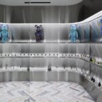 Destaca el uso de mármol de Carrara, acero inoxidable y vidrio, junto con una impresionante instalación en el techo que utiliza moldes de zapatillas Air Force 1 para crear un patrón rítmico y escultural característico de Snarkitecture.