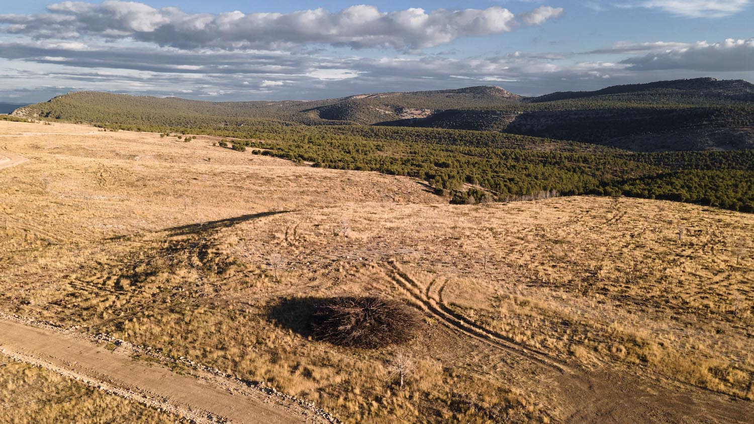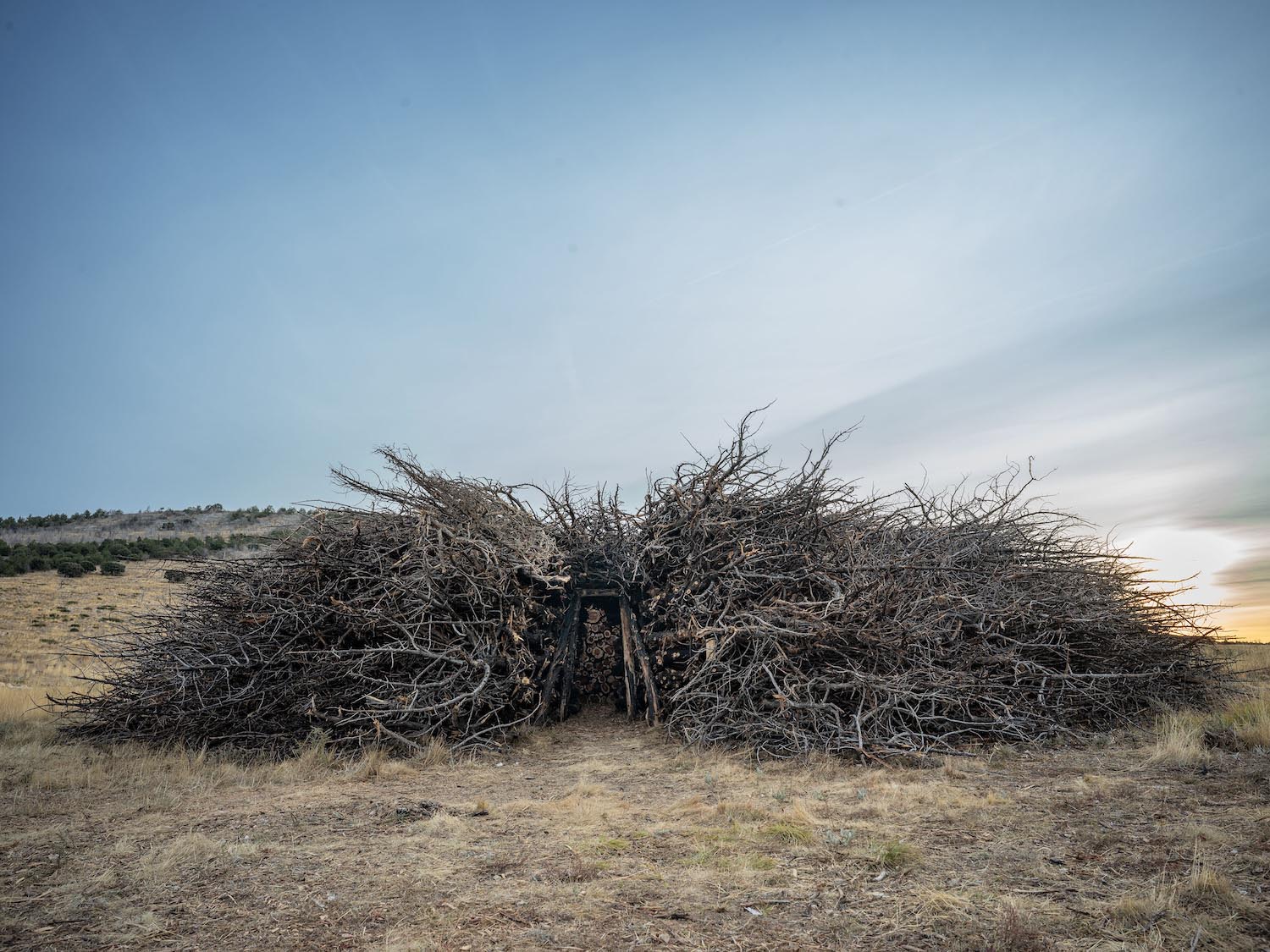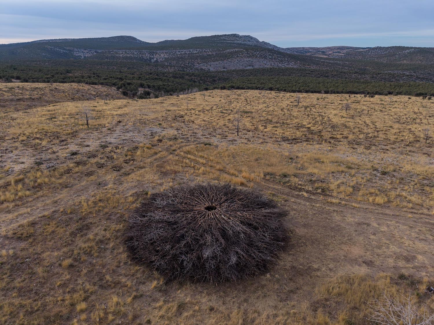 En 2022, tuvo lugar en el Parque Natural Sabinares de Arlanza – La Yecla uno de esos fuegos rurales que arrasó una vasta extensión de territorio. Pero para no olvidar que de la tragedia llega el renacimiento, el estudio artístico creó Socarrado: una estructura circular erigida íntegramente con troncos de enebro que fueron recuperados tras el incendio, siendo el músculo humano los vecinos, los voluntarios, comerciantes locales y otros colaboradores. Todos ellos fueron parte indispensable para la recolección y el montaje posterior.
