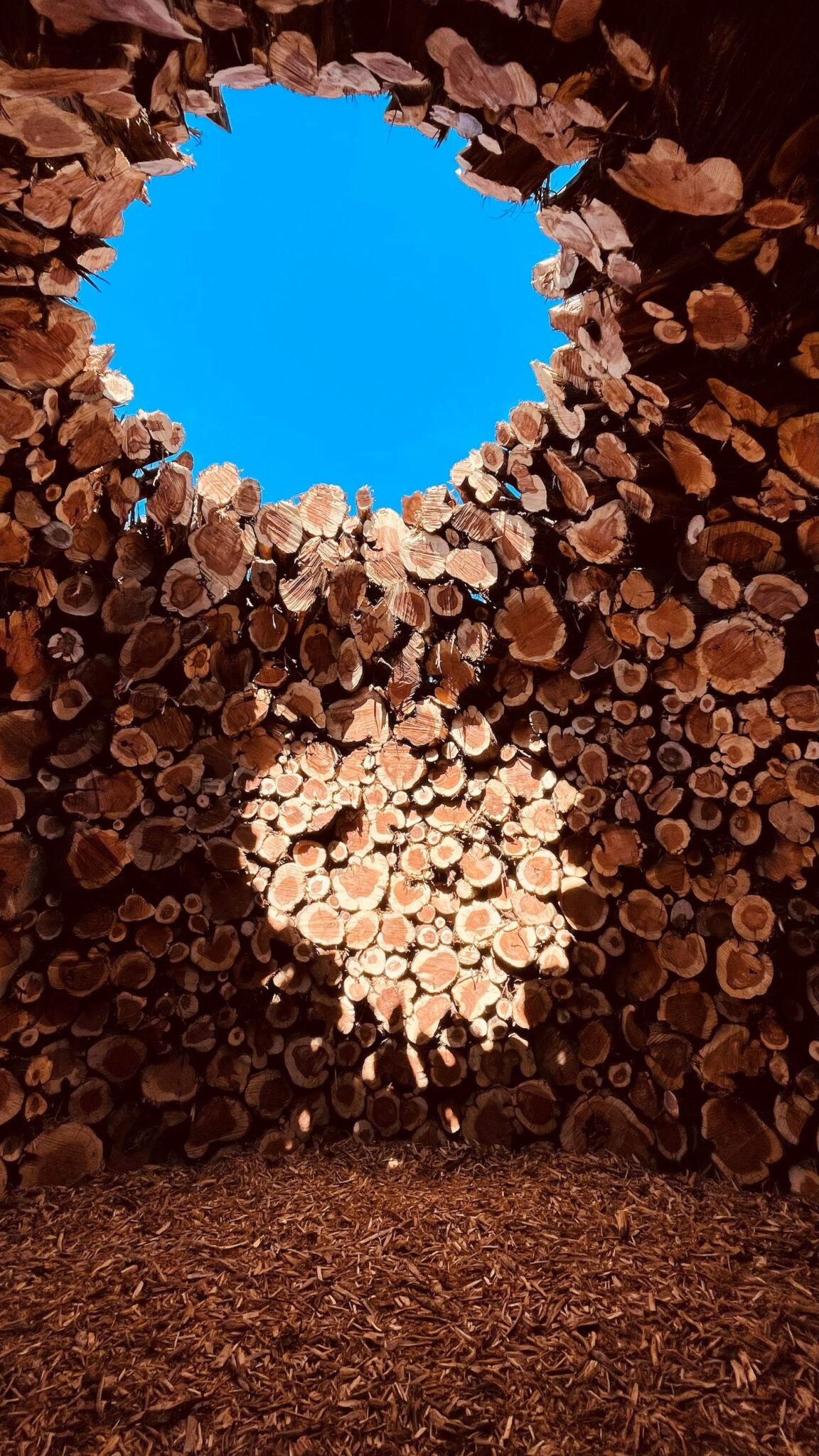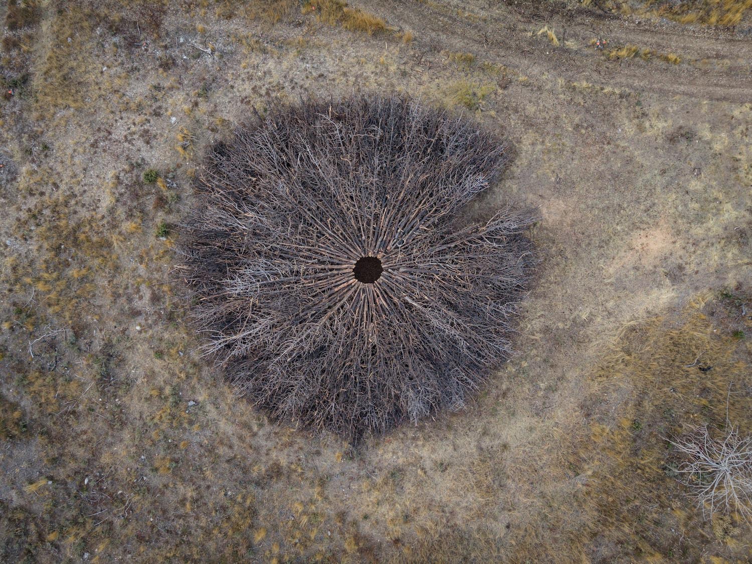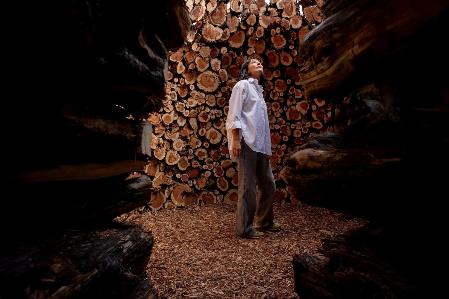 El taller creativo de Nomad Studio entiende esta intervención como un modo de refugiar la memoria, para no perder nunca de perspectiva los ciclos de destrucción y regeneración de la tierra. Más allá de la herida visible del terreno, los tiempos contemporáneos terminan distanciando al ser humano del ecosistema que habita. Por eso idearon este gran anillo de 15 metros de ancho con los restos ennegrecidos, dispuestos de forma concéntrica: una configuración circular que genera una fortaleza de madera que, si bien ha sido testigo de las llamas, todavía conserva su mensaje renovador, salvífico, casi litúrgico.