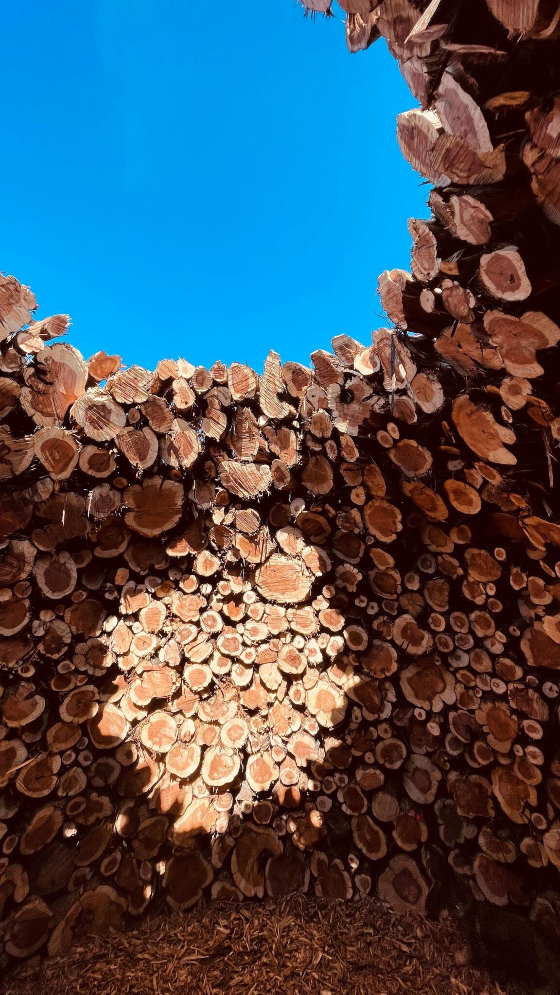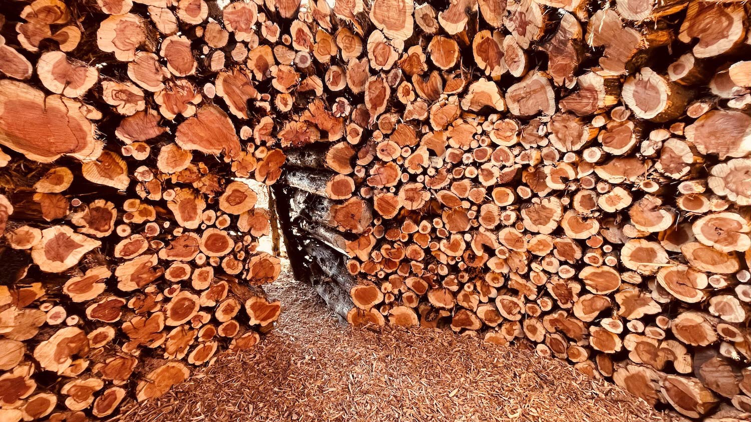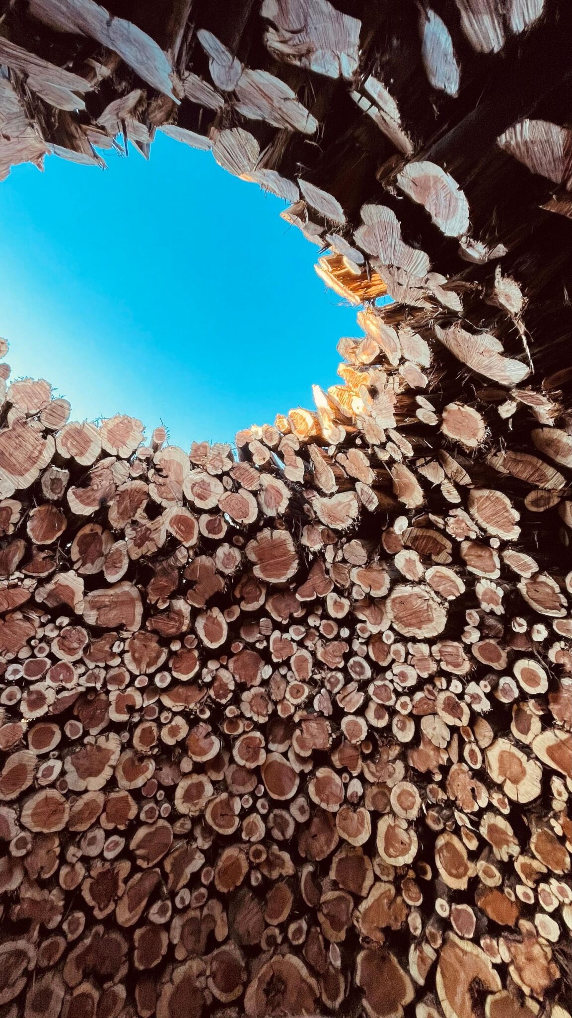 El taller creativo de Nomad Studio entiende esta intervención como un modo de refugiar la memoria, para no perder nunca de perspectiva los ciclos de destrucción y regeneración de la tierra. Más allá de la herida visible del terreno, los tiempos contemporáneos terminan distanciando al ser humano del ecosistema que habita. Por eso idearon este gran anillo de 15 metros de ancho con los restos ennegrecidos, dispuestos de forma concéntrica: una configuración circular que genera una fortaleza de madera que, si bien ha sido testigo de las llamas, todavía conserva su mensaje renovador, salvífico, casi litúrgico.