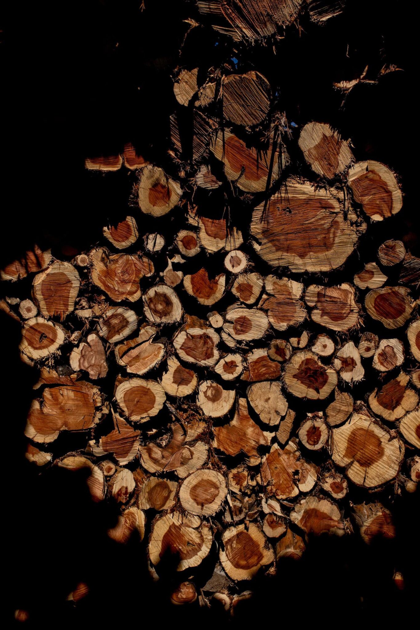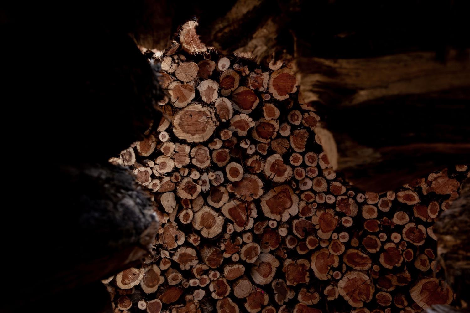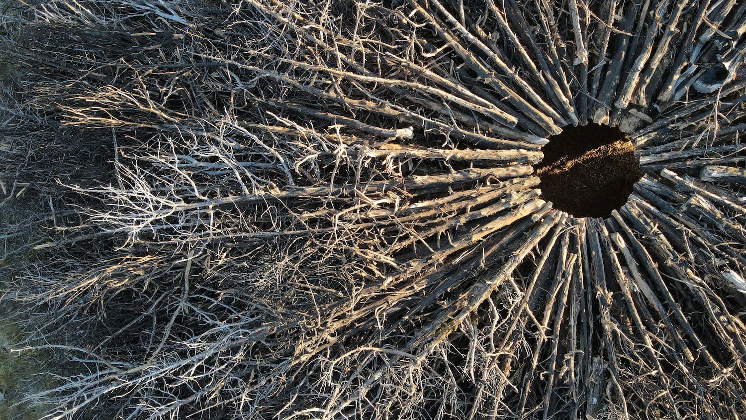 El perímetro de enebro quemado, huella latente del fuego, otorga así otro peso al poco sol que deja pasar. Lo hace en su centro, a través de una cavidad de tres metros de diámetro, a la manera de las cámaras abovedadas de antaño. Una abertura al cielo que difumina los haces de luz que se entrometen entre la densidad de los elementos recogidos. Fueron las propias personas autóctonas de la zona las que comprendieron el impacto de la empresa y, con su hazaña, instaron y consiguieron que las autoridades de Burgos mantuviesen Socarrado, a pesar de que el plan original era desmantelarla, dado que había sido concebida como parte de la Exposición No Comisionada por Novo Collective en Santo Domingo de Silos para la reflexión sobre comunidad y entorno.