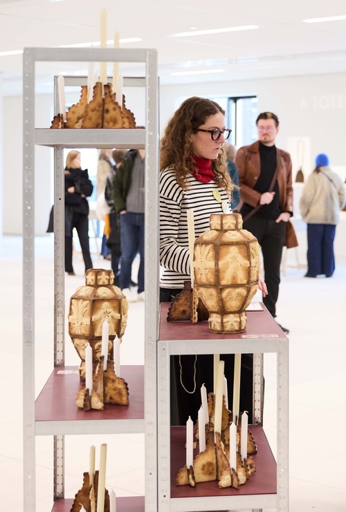 Esa misma lógica está en la base del trabajo de Studio CoPain: el pan alimenta al cuerpo físico, pero también al cuerpo social de un grupo. Incluso la etimología lo confirma: “compañero” proviene del latín cum panis, “el que comparte el pan”. Para Studio CoPain —el colectivo compuesto por Léa Bardin, Lucile Barbier y Sidonie Lepetit— el pan es medio y mensaje. Comenzaron su práctica en 2023, un año antes de graduarse en la Design Academy Eindhoven, donde fundaron su estudio. Desde entonces exploran las posibilidades expresivas de la masa madre. El pan no es solo un objeto comestible: es un material maleable, un medio para relacionarse y un portador de cultura.