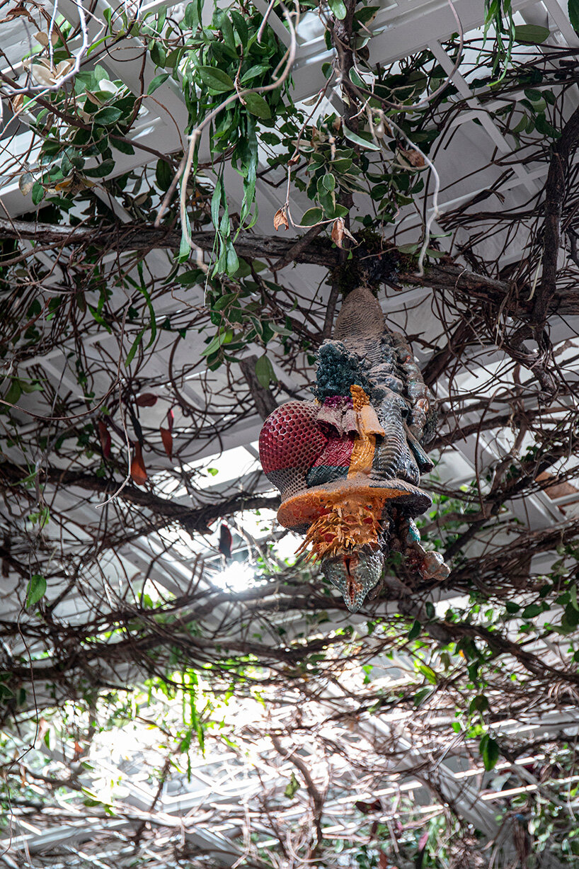 Con este proceso invalida la función de conservación para transformar el centro en un territorio salvaje, donde la materia orgánica invade lo institucional y la frontera entre interior y exterior se disuelve. En este entorno inverosímil se despliega su serie escultórica The End of Imagination (2022-en curso), núcleo de la exposición. Son formas híbridas y sobrenaturales que parecieran extraídas de otra era. Entre ellas, destacan El fin de la imaginación III (2024) donde una especie de cíborg derrotado aguarda un final irreversible; también The End of Imagination VI (2024), ejemplo de esas mezclas imposibles de materiales —plantas, metales, etc.— tan característicos del artista.