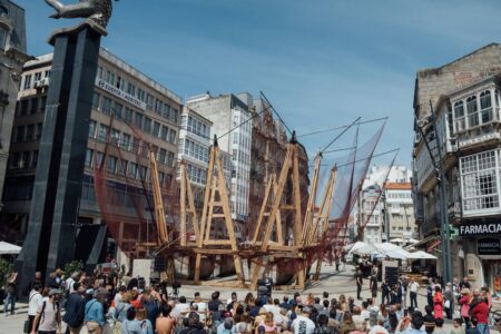 Aun así, resulta difícil resistirse a los encantos del objeto. El color y la textura de las redes —tejidas a mano por la asociación de Redeiras Atalaia—, la fuerza de la sal del mar sobre la madera reciclada o el juego de mástiles y tirantes de varias decenas de metros de altura convierten la Puerta do Sol en un espacio protagonista hasta el final de la fiesta. Luego habrá que aprender de nuestros aciertos.