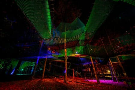 Un complejo recreativo construido con redes y cuerdas que permite recorrer en altura el claro de un bosque.