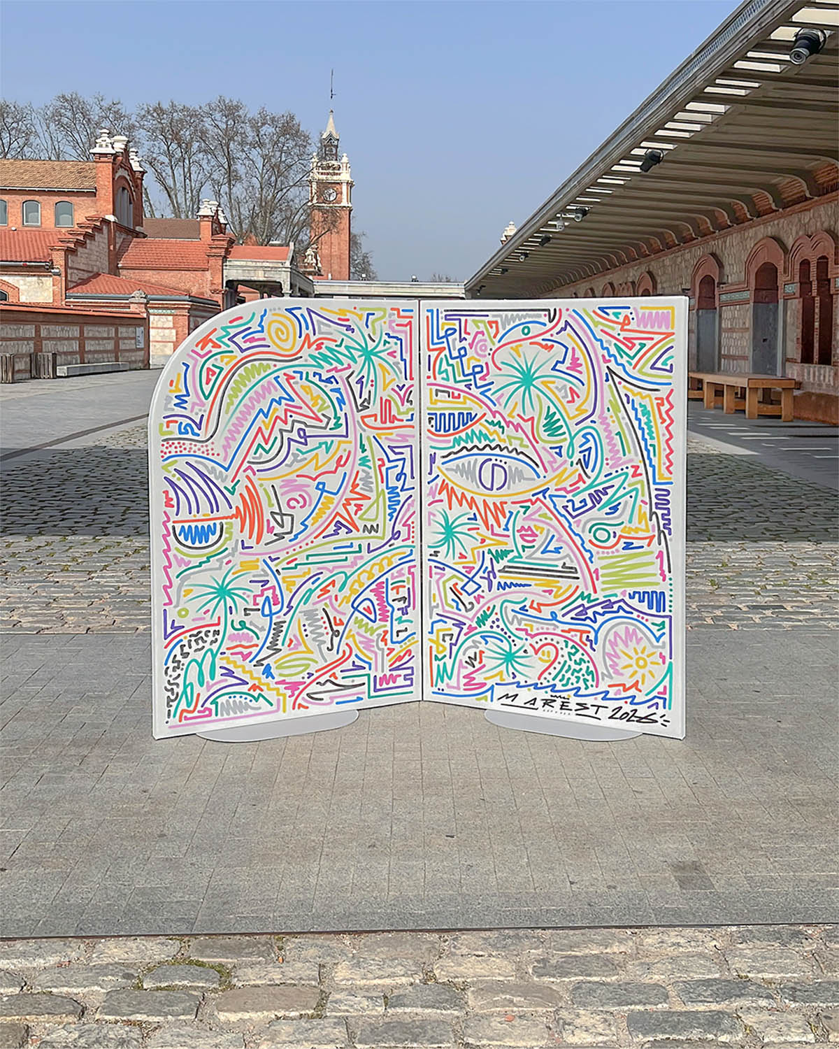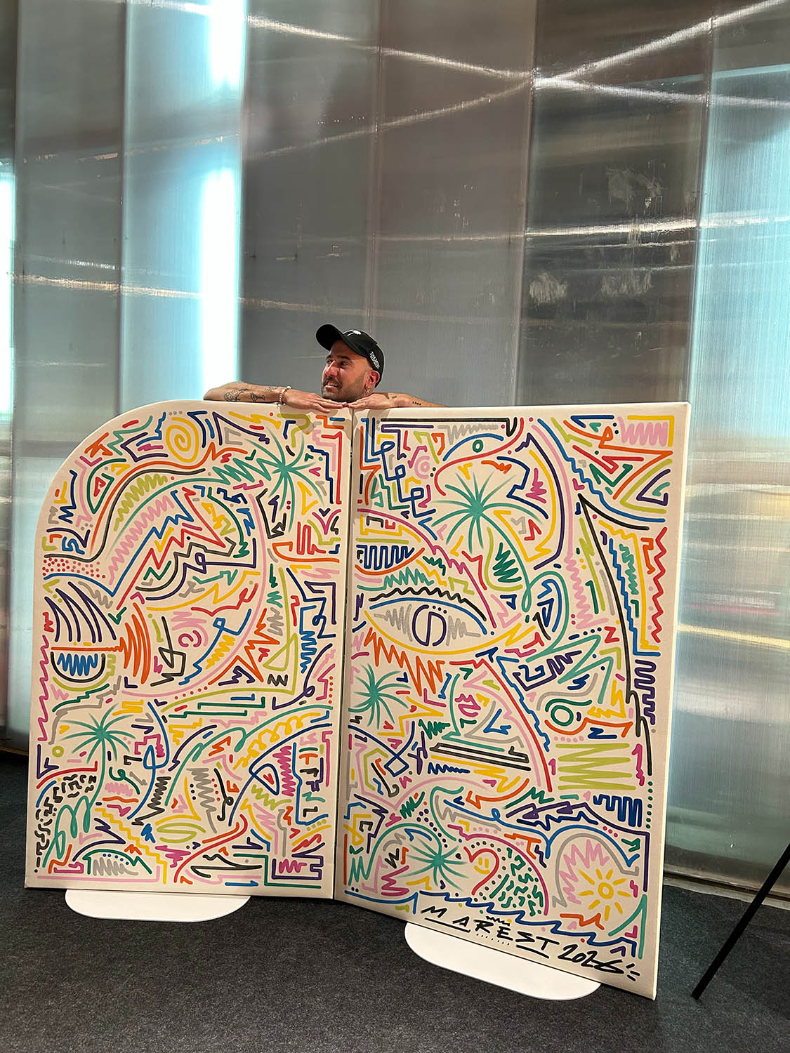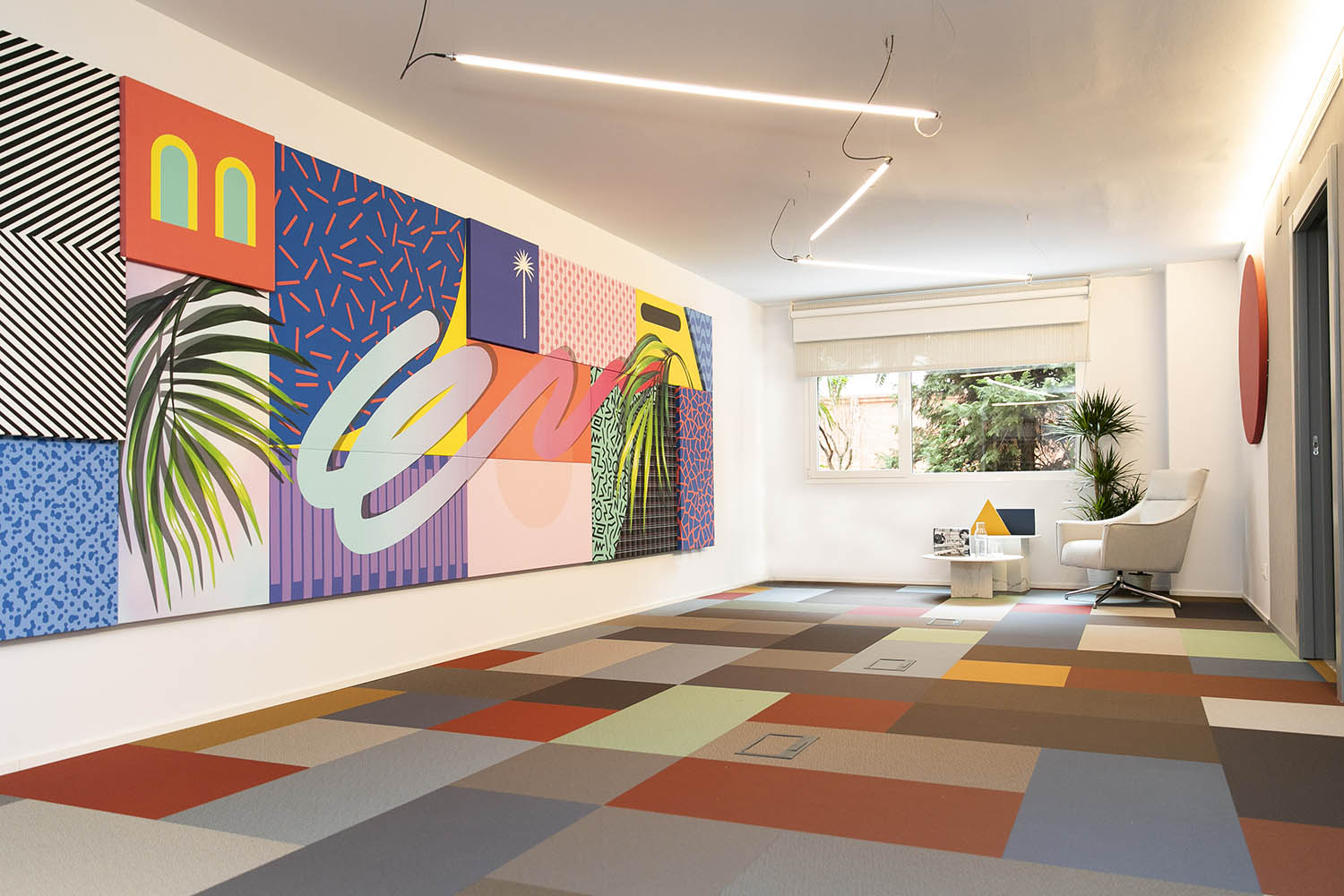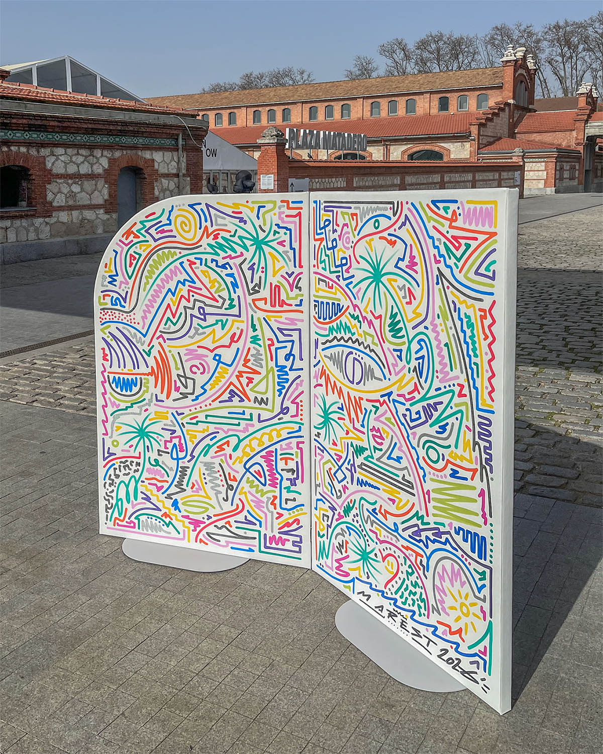 El día de la inauguración, el ilustrador alicantino pintó en directo para todos los asistentes sobre los paneles acústicos Plec Divider de Vertisol, poniendo a prueba el tejido técnico que forraba los módulos. La performance consistió en recubrir por completo las dos partes de la pieza con acrílicos, rematando todo con un trazo lúdico, colorido, rebelde y muy Memphis. ¿El resultado? Por un lado, un objeto único, desenfadado y refrescante capaz de convertirse en la estrella de un espacio. Por otro, la consecuencia de cómo la tecnología textil puede pasar a ser un gran aliado de la expresión artística.