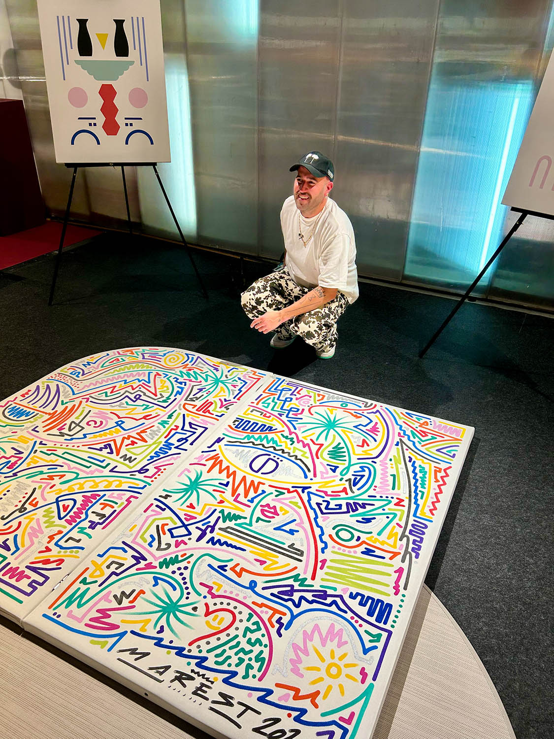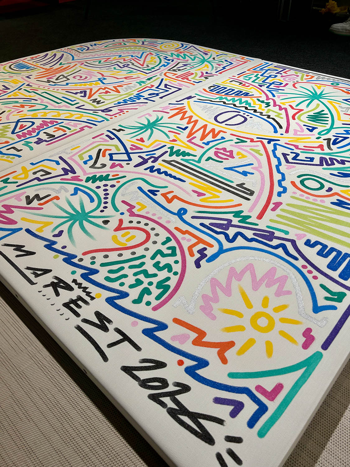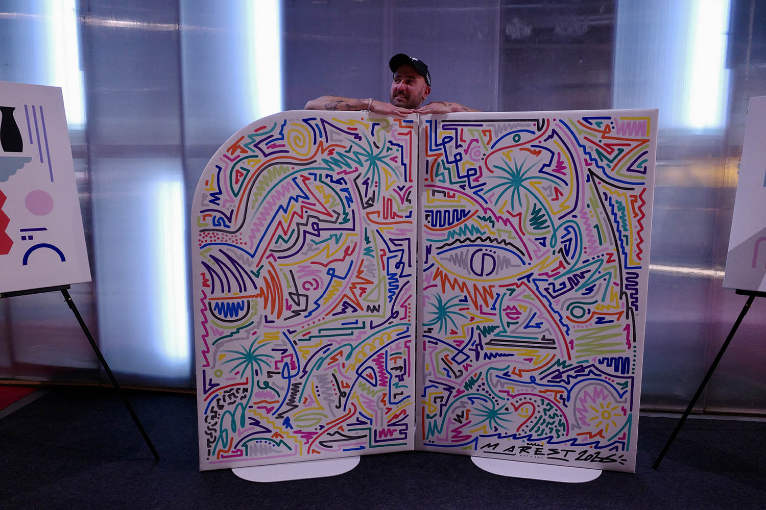 El día de la inauguración, el ilustrador alicantino pintó en directo para todos los asistentes sobre los paneles acústicos Plec Divider de Vertisol, poniendo a prueba el tejido técnico que forraba los módulos. La performance consistió en recubrir por completo las dos partes de la pieza con acrílicos, rematando todo con un trazo lúdico, colorido, rebelde y muy Memphis. ¿El resultado? Por un lado, un objeto único, desenfadado y refrescante capaz de convertirse en la estrella de un espacio. Por otro, la consecuencia de cómo la tecnología textil puede pasar a ser un gran aliado de la expresión artística.