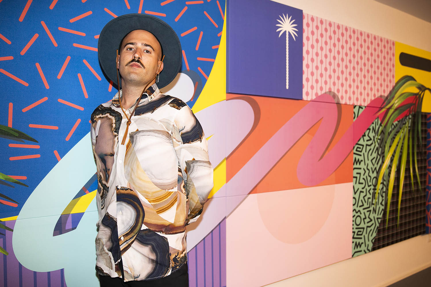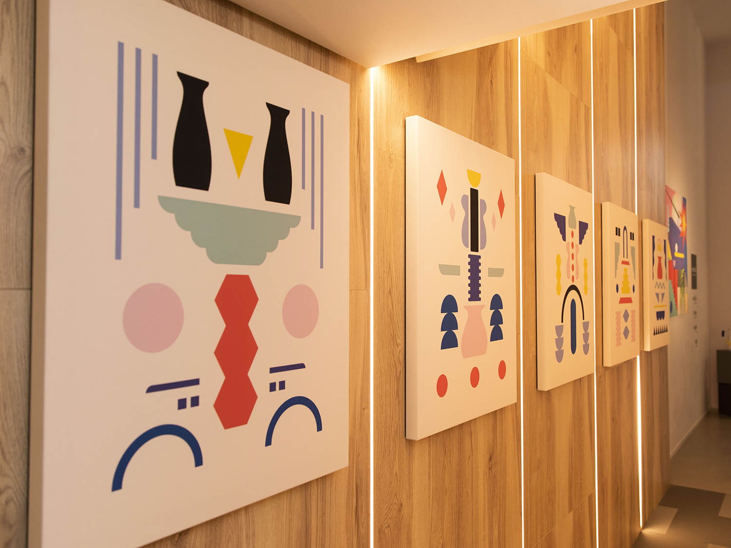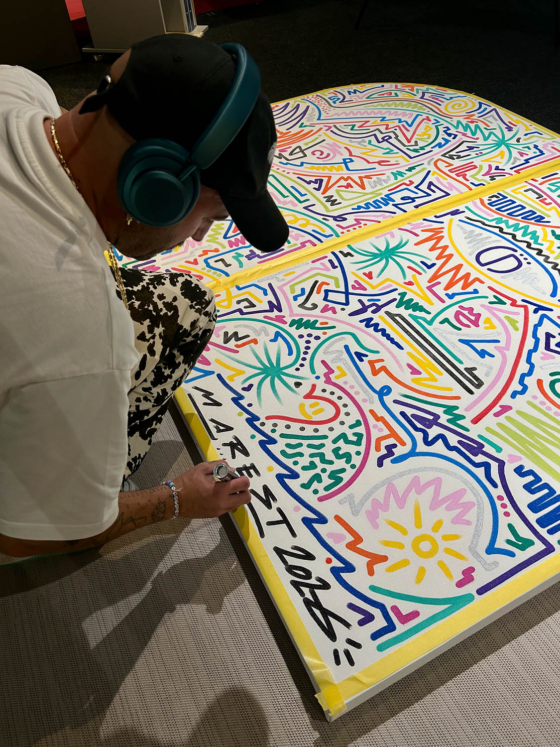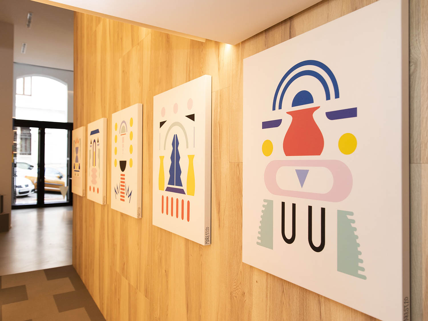 El día de la inauguración, el ilustrador alicantino pintó en directo para todos los asistentes sobre los paneles acústicos Plec Divider de Vertisol, poniendo a prueba el tejido técnico que forraba los módulos. La performance consistió en recubrir por completo las dos partes de la pieza con acrílicos, rematando todo con un trazo lúdico, colorido, rebelde y muy Memphis. ¿El resultado? Por un lado, un objeto único, desenfadado y refrescante capaz de convertirse en la estrella de un espacio. Por otro, la consecuencia de cómo la tecnología textil puede pasar a ser un gran aliado de la expresión artística.