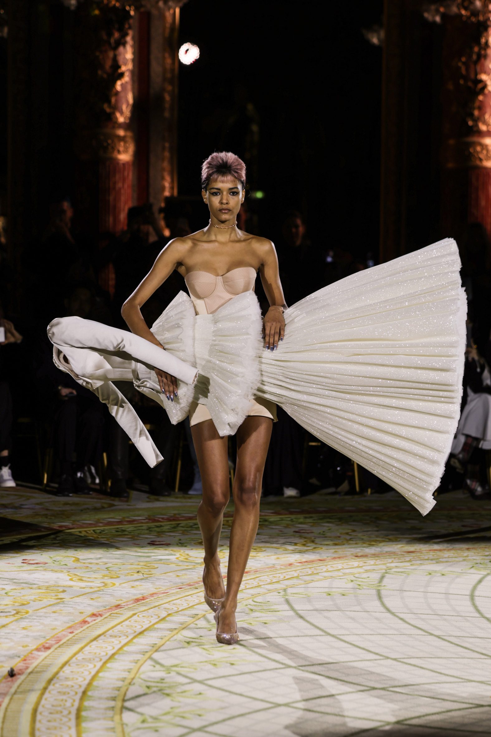 Una luz suave iluminaba la gran alfombra imperial que cubría el suelo. Violines y un piano sonaban de fondo. Fue así como comenzó a desfilar la primera modelo con un espectacular vestido blanco de pedrería, seguida de otra con uno en un degradado rosa y azul. De repente, los siguientes que se iban sucediendo empezaron a romper un poco el patrón de los primeros: los vestidos parecían haberse desprendido de los cuerpos y haber cobrado vida propia.