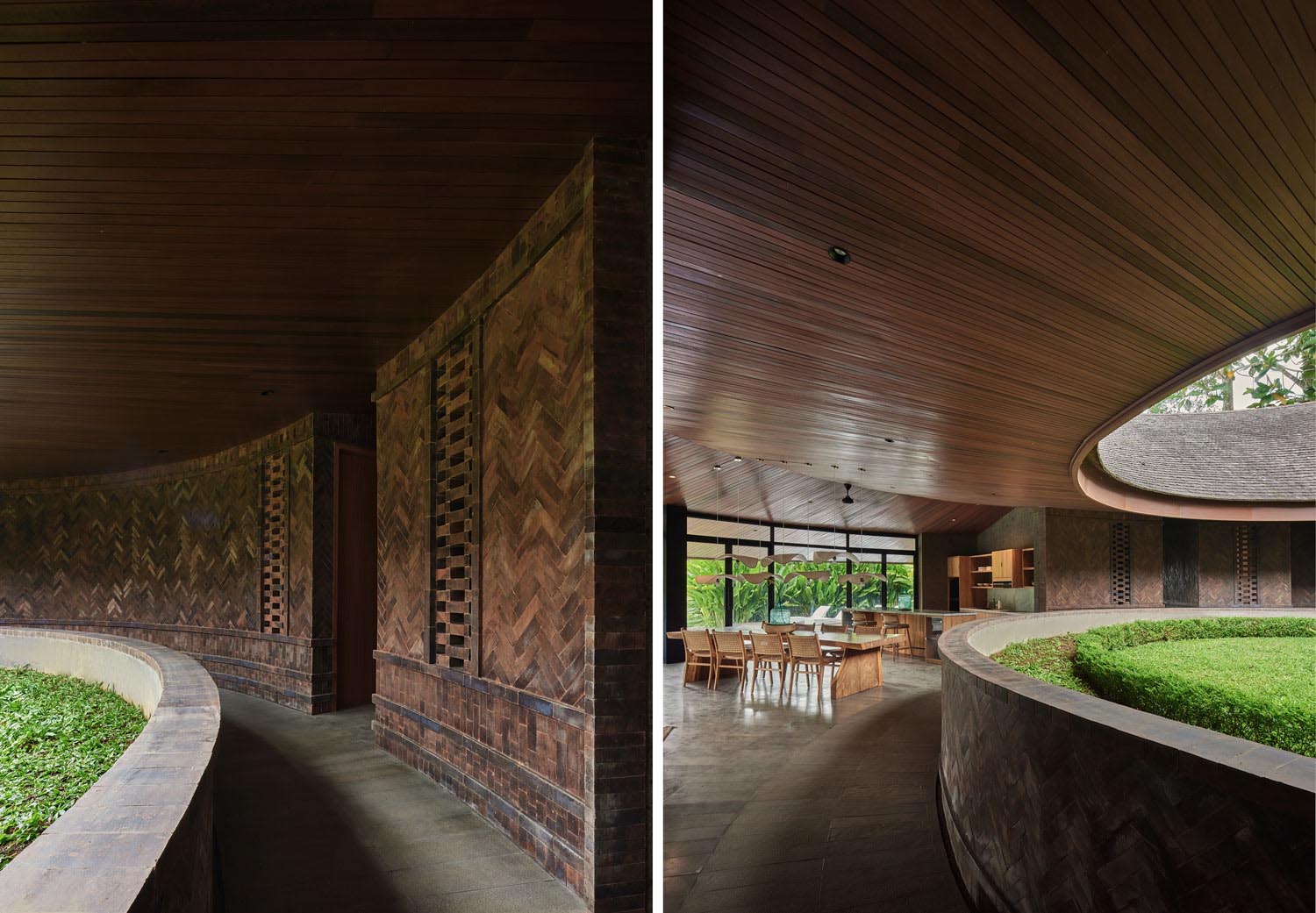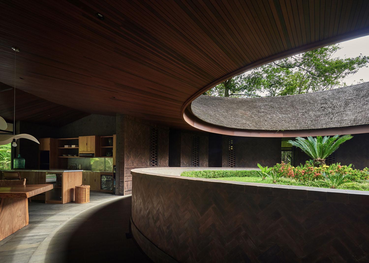 La propuesta resuelve las circulaciones por dentro —por el lado más íntimo— pero también por el más corto. Una descripción que podría encajar en una construcción de cualquier parte del trópico salvo por un detalle: una forma por la que nos causa tanta intriga. Es posible que sea un capricho, un empeño del promotor o del arquitecto, ya sea con el fin de ser recordado o como divertimento ante un encargo que amenazaba con ser aburrido. Quizás sea un modo de proteger la privacidad de los huéspedes o de crear una escena que solo se preocupe de lo que pasa dentro. ¿Hay mayor lujo que mirarse disfrutando?