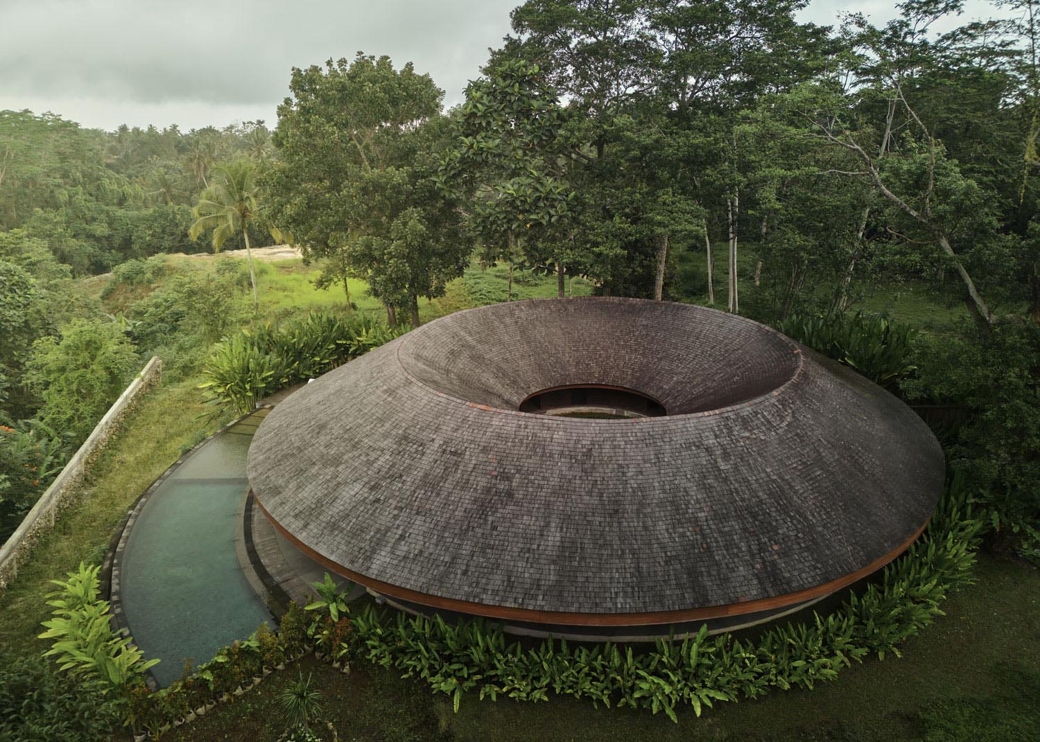 La planta de Villa Omah Prana se dibuja dentro de un círculo perfecto. El estudio de Alexis Dornier decidió utilizar esta forma para resolver el encargo de una cabaña de 4 habitaciones para un resort en Bali. Es inevitable mirar con extrañeza un planteamiento que puede ir en contra del aprovechamiento espacial o de la geometría de los materiales, pero de un primer vistazo el resultado parece lo suficientemente pintoresco como para captar nuestra atención.