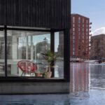 El hermetismo exterior de esta casa flotante se torna en transparencia interna, transformando las particiones en líneas invisibles y desencadenando conexiones visuales que amplían el espacio y lo extienden hasta los confines del canal. Dos colores protagonizan esta pieza, el blanco y el negro, conversando con el mismo minimalismo de los materiales que la construyen y que aportan tonalidades de calma y silencio en contraste con el bullicio geométrico que la rodea.